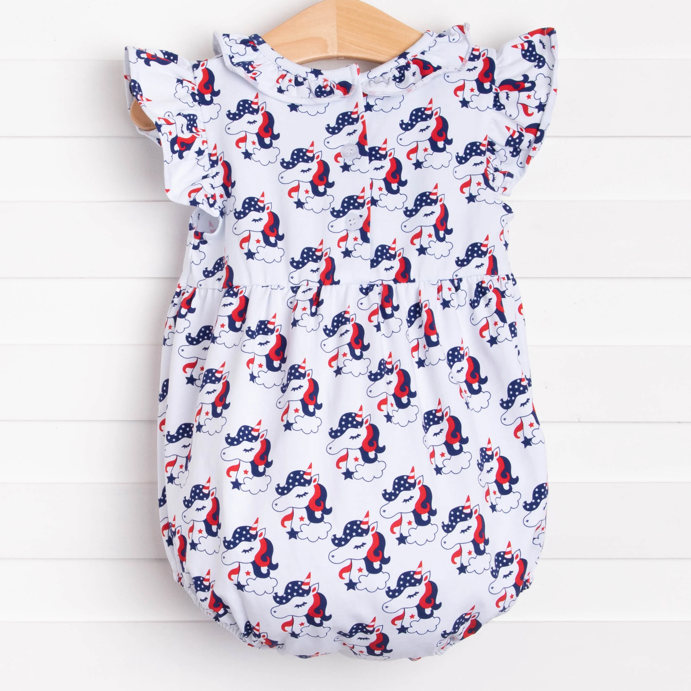 She'll be living the Americorn dream this summer in this unicorn-filled bubble! White, knit bubble features a patriotic unicorn print, precious flutter sleeves, and a darling ruffle collar. Snaps at the stride provide the ultimate convenience when dressing and changing. Make those patriotic moments even more magical with this enchanting one-piece!