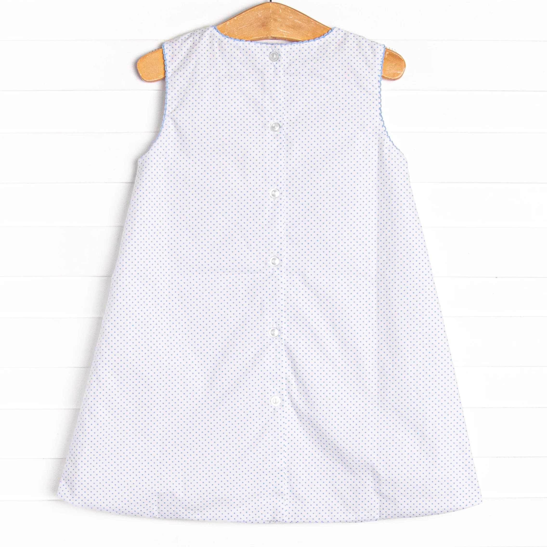 Anchors Aweigh! This dress features a blue bitty dot print, buttons on the back, and an anchor applique. Your little sailor will look too cute!