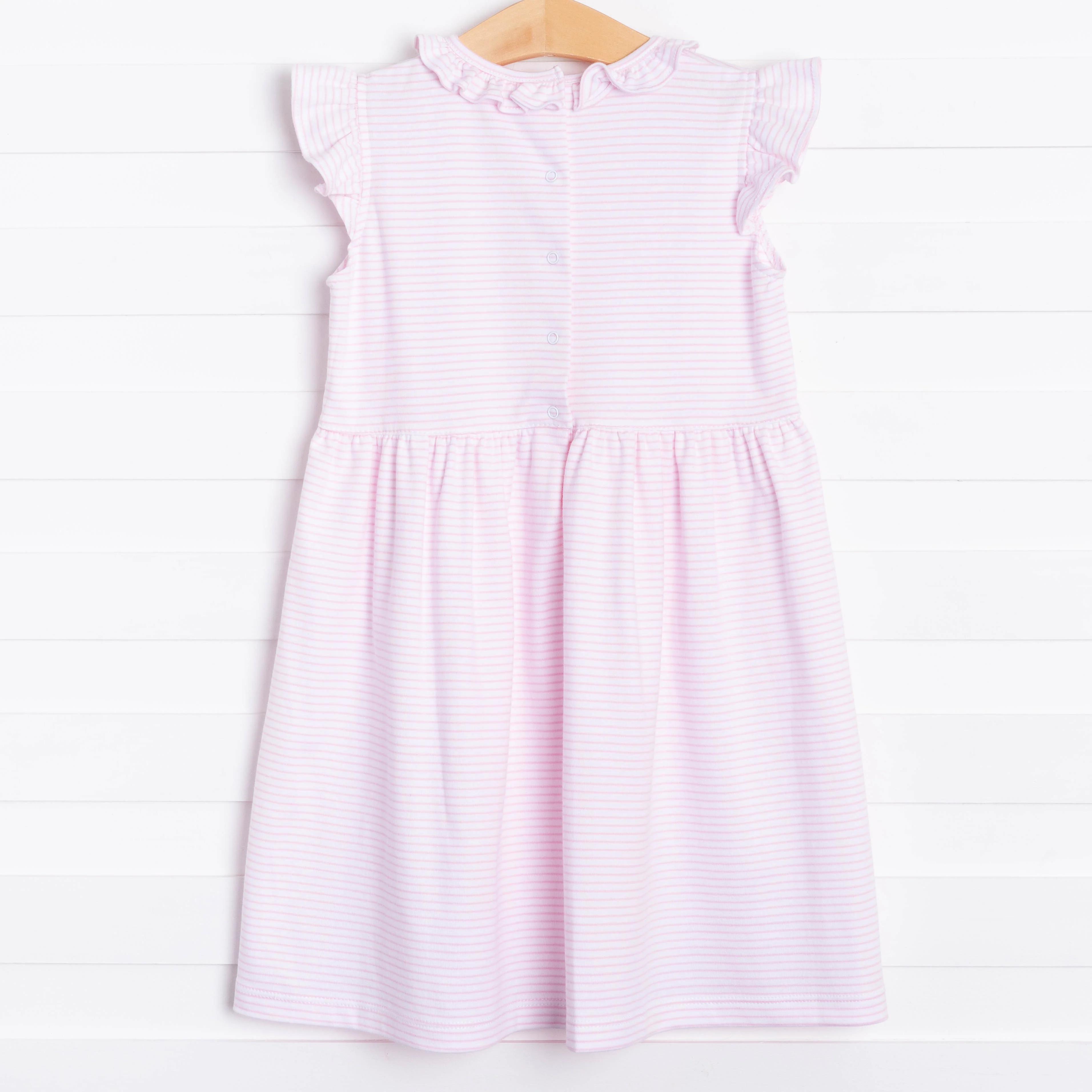 Watch your heart sail away when you see how precious your little lady looks in this sweet dress! Light pink stripes, delicate ruffle detailing, and a dainty embroidered sailboat will surely make this outfit one of her everyday favorites! Buttons at the neck for convenience. SIZE GUIDE