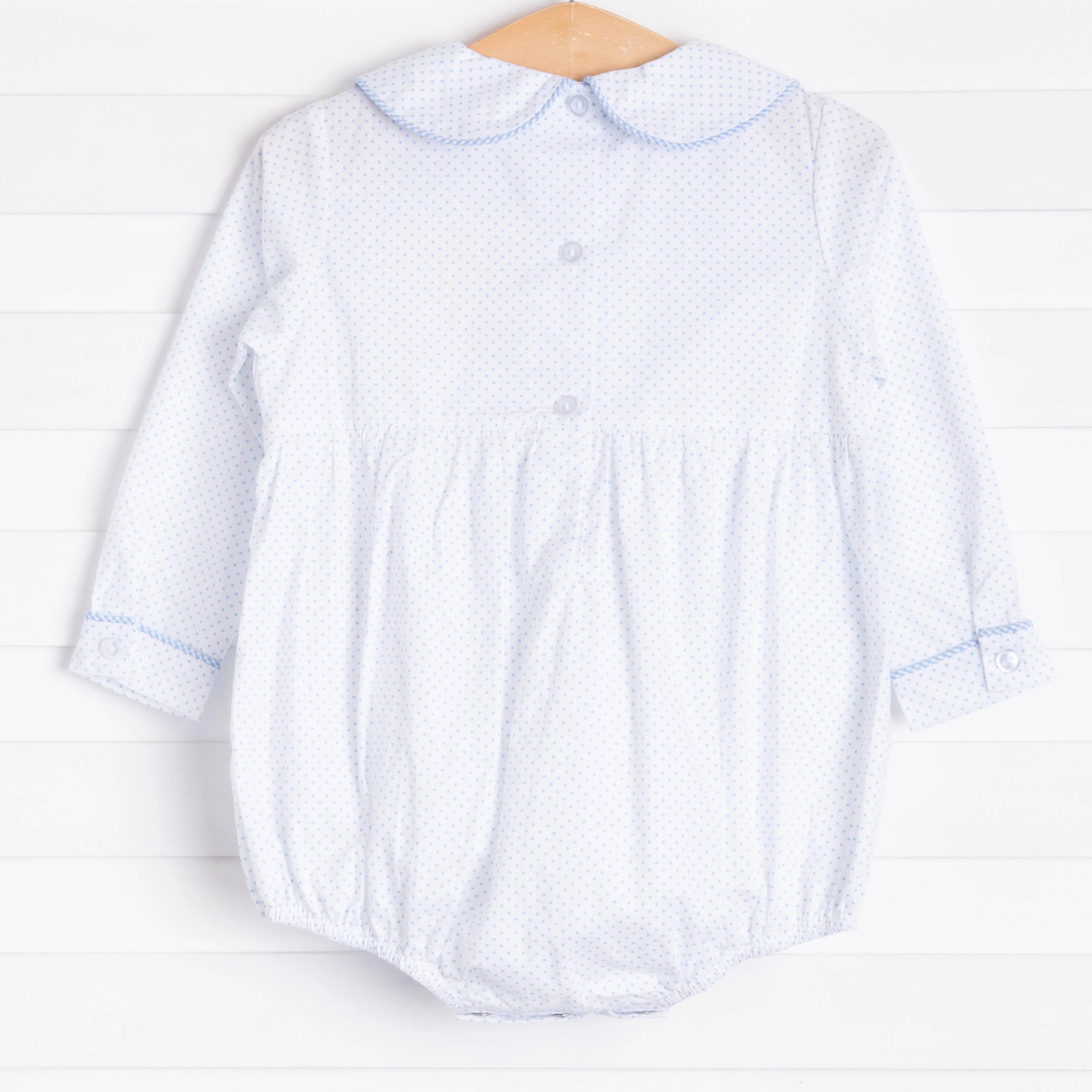 Happy Birthday! This is the perfect outfit for your little's one special day! This bubble is featured in a blue bitty dot, Peter Pan collar trimmed in gingham piping, long sleeves, with all the birthday essentials smocked panel across the chest! SIZE GUIDE