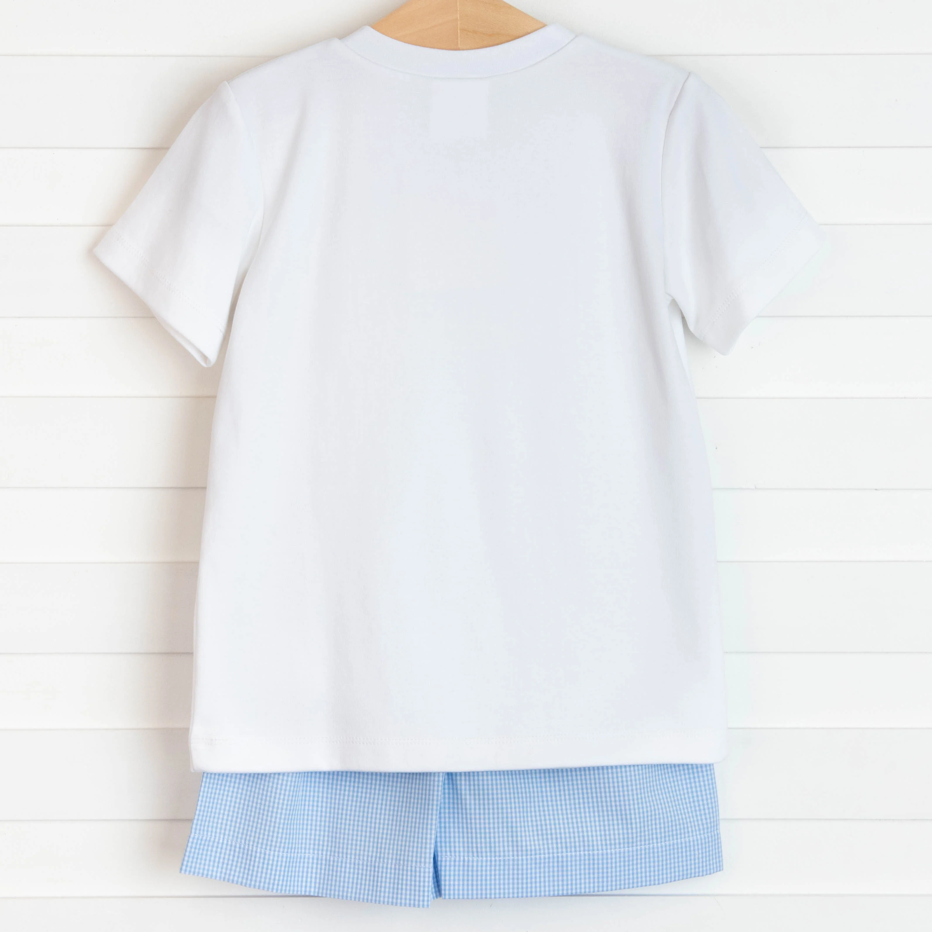 This short set is a birthday wish come true! Beautiful birthday smocking featuring a party hat, birthday cake and present! Completed with blue gingham pocket shorts to match!