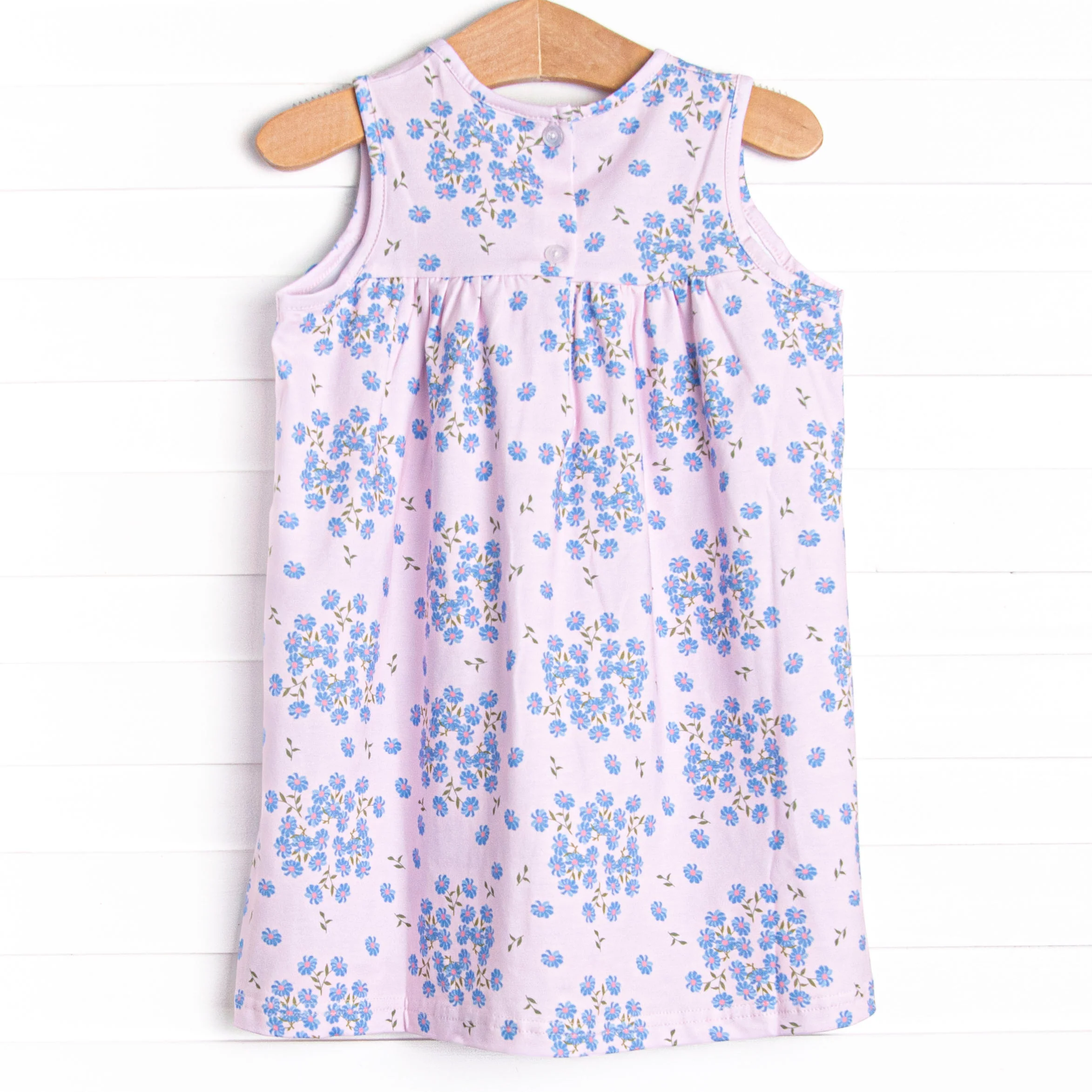 Beautiful Blue Bundle Bows! This dress features a pink floral print, blue bows, and button closure on the back. This dress is fun and floral fantastic!