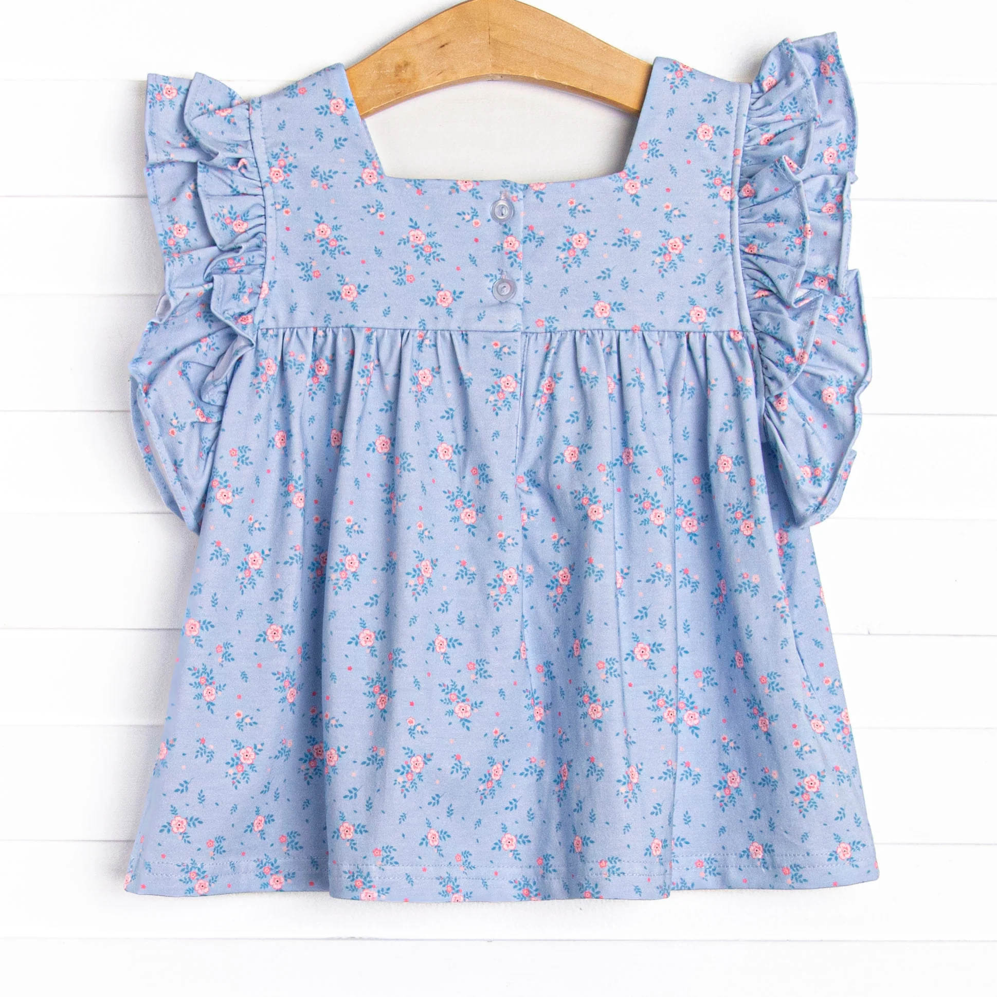 We have the sweetest spring styles for her! This set features a blue floral print, ruffle flutter sleeves, and the softest knit material. She will have fun in florals in this top!