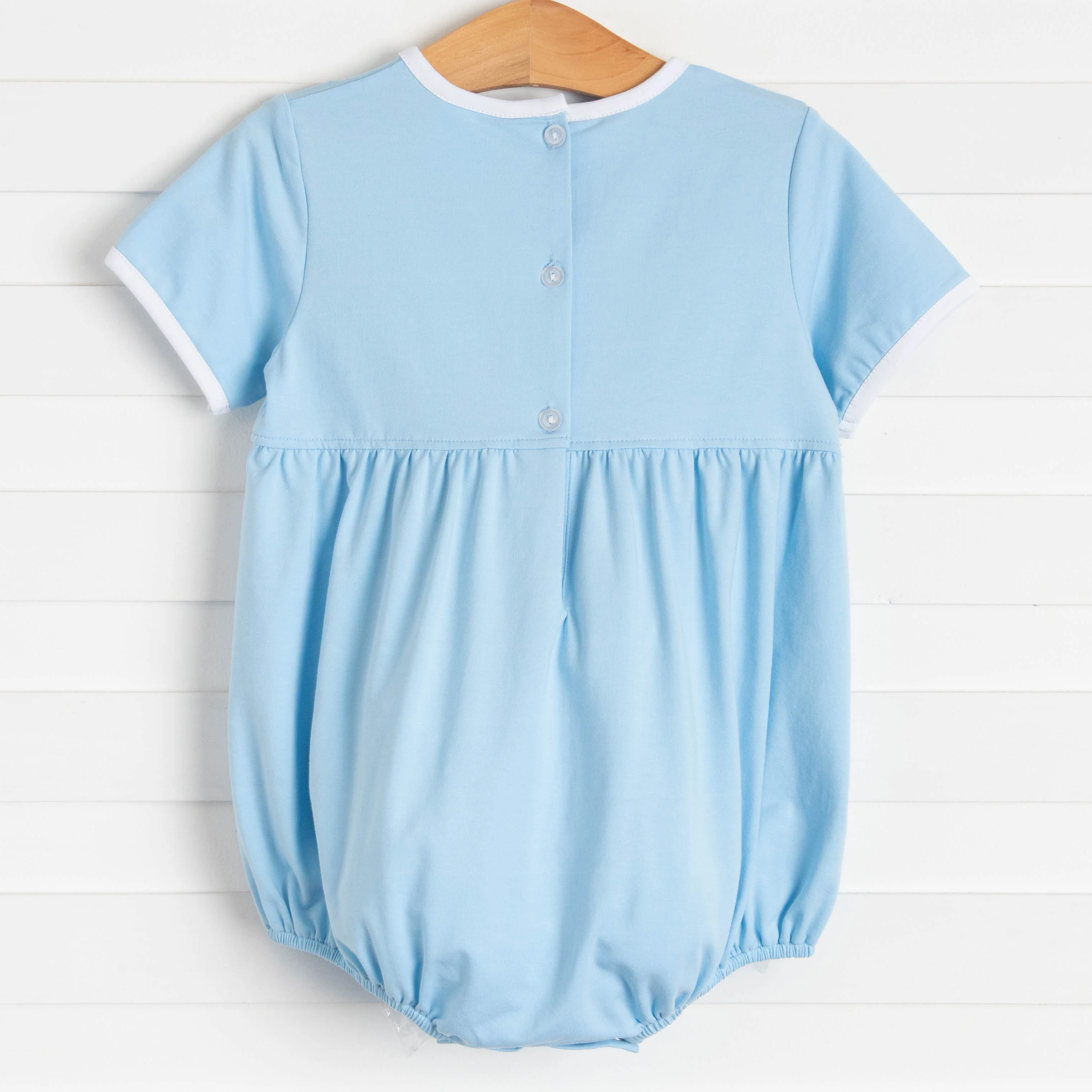Hop on board! Hit the sky in bunny's sweet ride! Light blue, knit bubble features white trim, bunny and airplane applique across the chest, buttons at the back, and snaps at the stride for convenience. Your little one will be set to soar for his next adventure in this soft and comfy bubble!