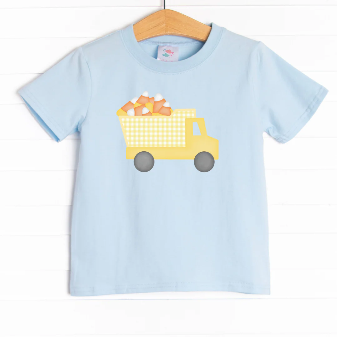 Loaded up this cute truck with a classic Halloween treat! Classic, short sleeve t-shirt with an easy, pull-on style you know and love! The shirt is featured in four colors; White, Heather Gray, Ballerina Pink, and Soft blue.