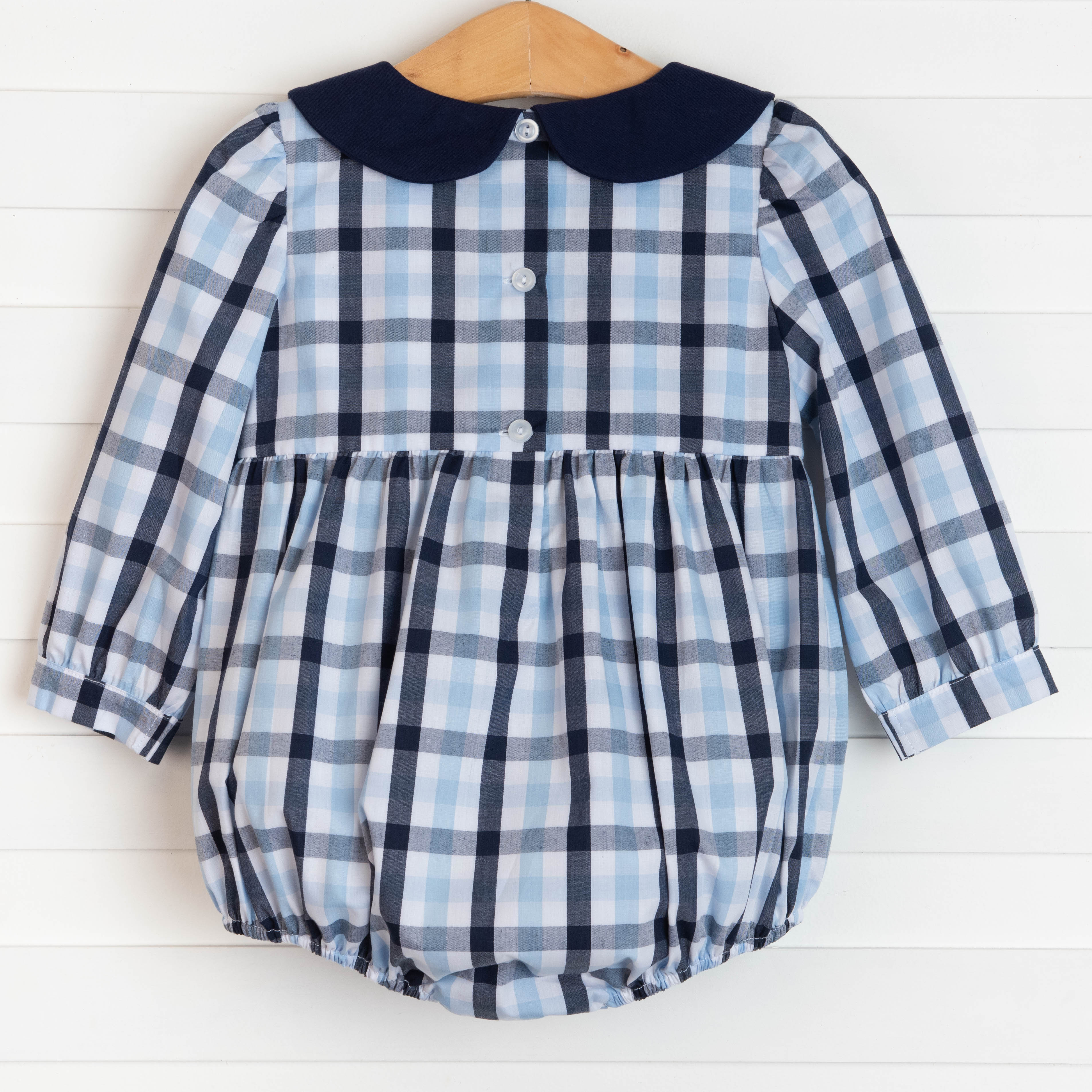 Our Charlie bubble is such a classic! This bubble features the most precious plaid print, tied collar, and snaps in the stride. This outfit will be a staple for you little one's fall! SIZE GUIDE