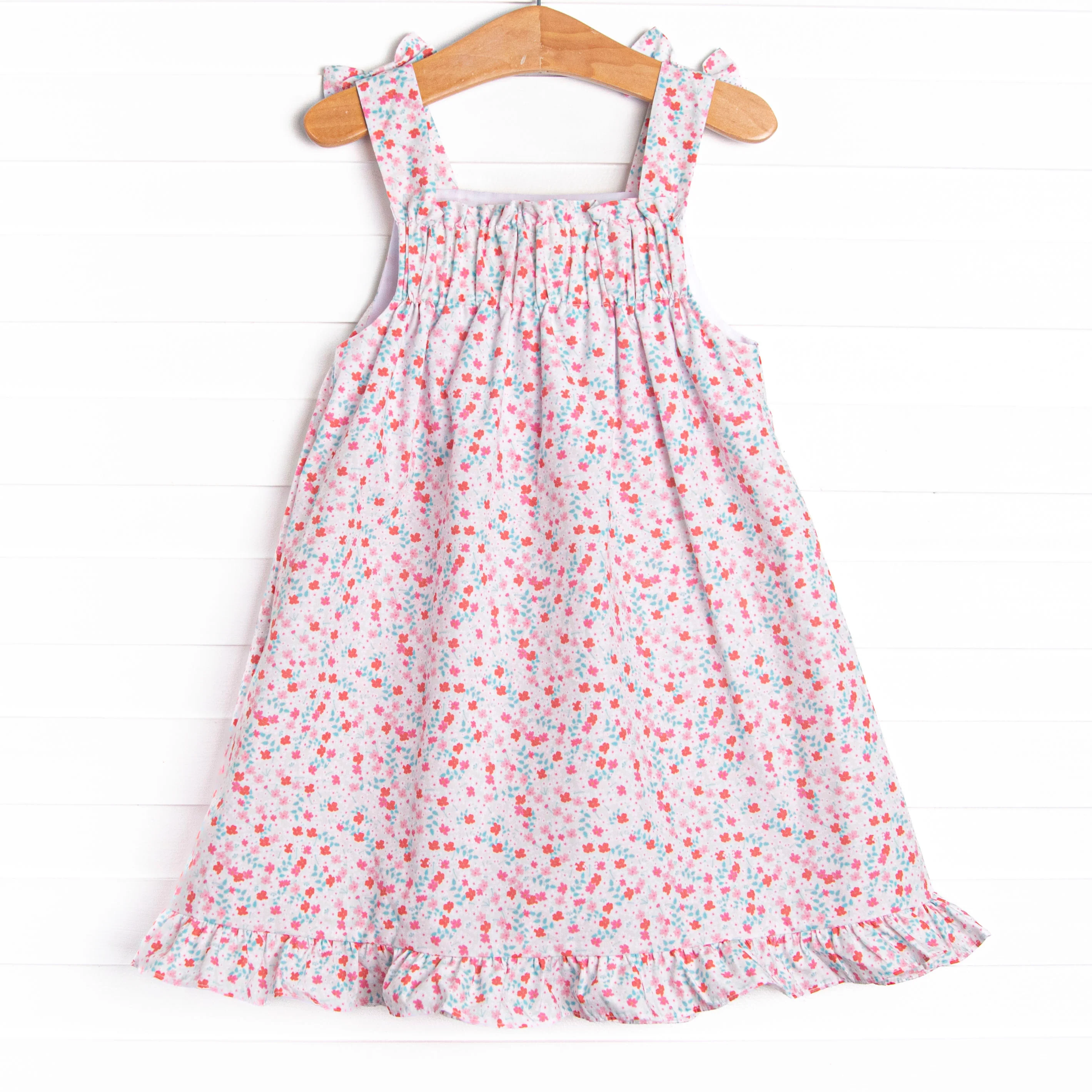 Cherry Tree Blooms! This dress features a red floral print, bows on the shoulders, and ruffle trim. She will have fun in florals!