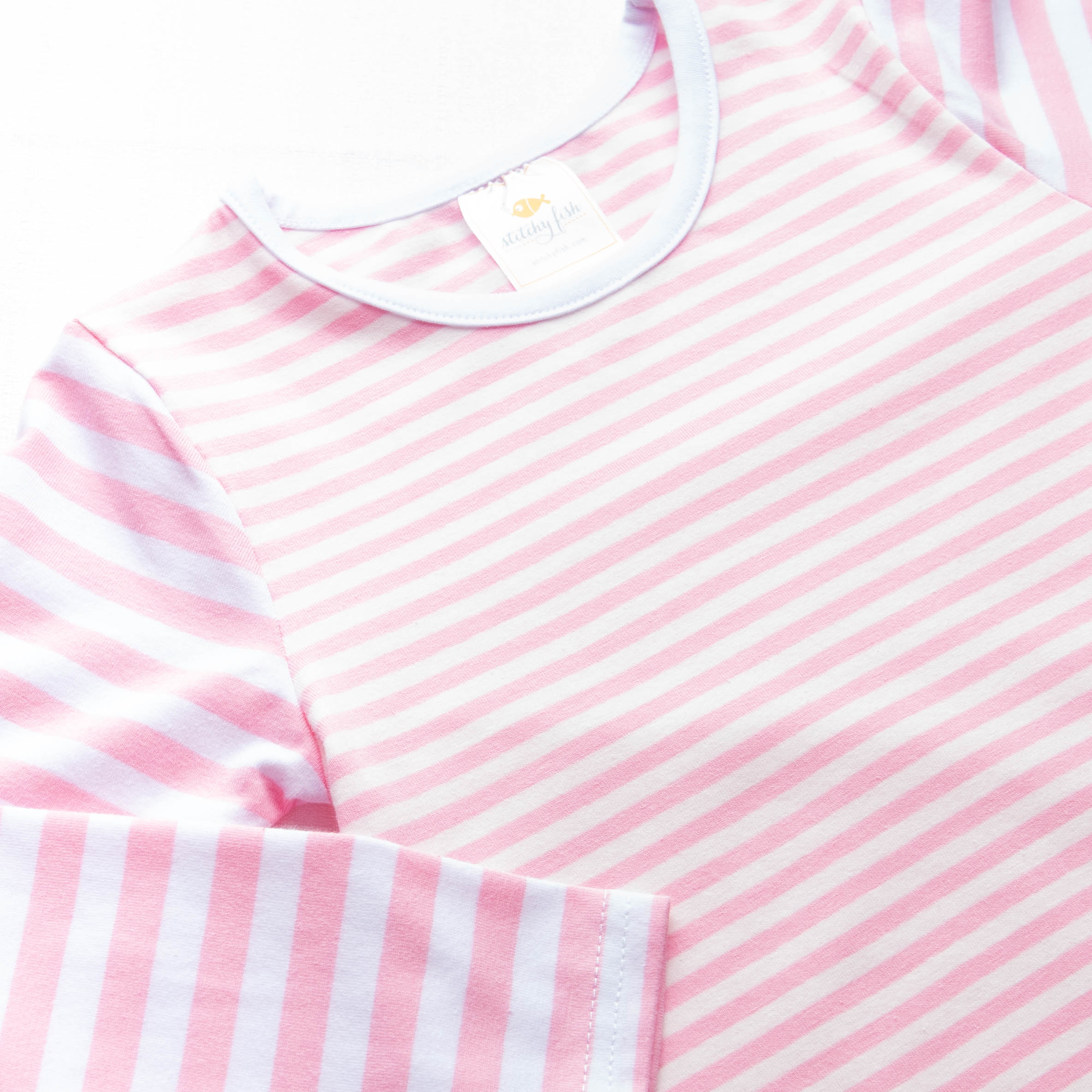 This dress is absolutely perfect for this season! The Claire dress is featured in long sleeves, pink and white stripes coordinating front pockets! Pair with her favorite leggings or boots for cooler days! SIZE GUIDE