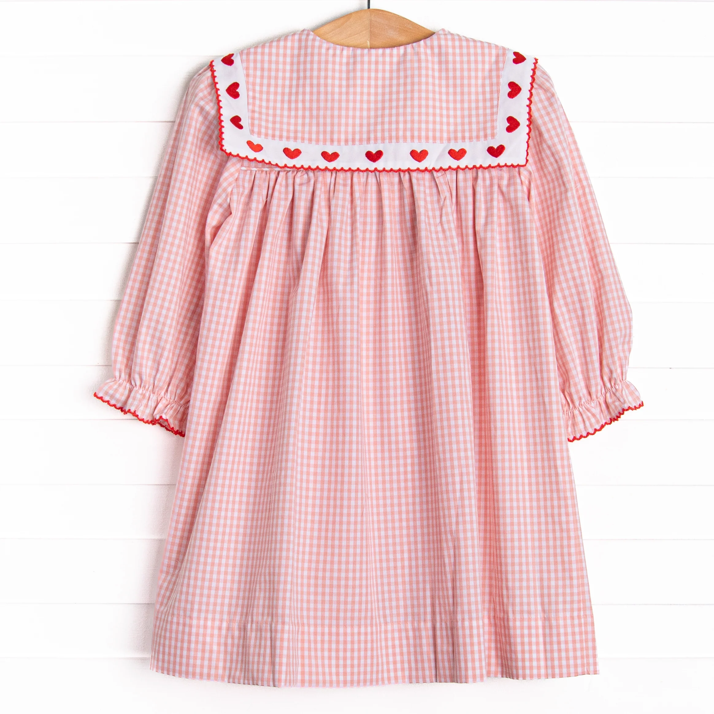 Keep her Close to the Heart! This dress features pink gingham print, a bib collar with heart embroideries, and a dainty red smocking. Your little one will look too cute in this dress!