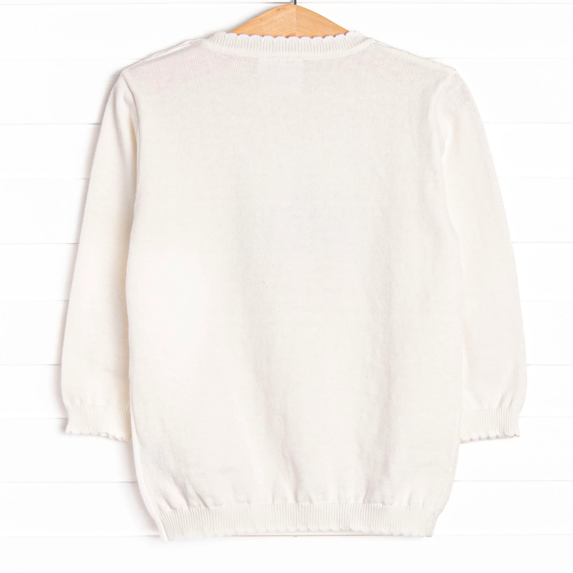The cutest Costal Comfort! This sweater features ivory white knit, buttons on the shoulders, and a pink sailboat. Perfect for your little one!