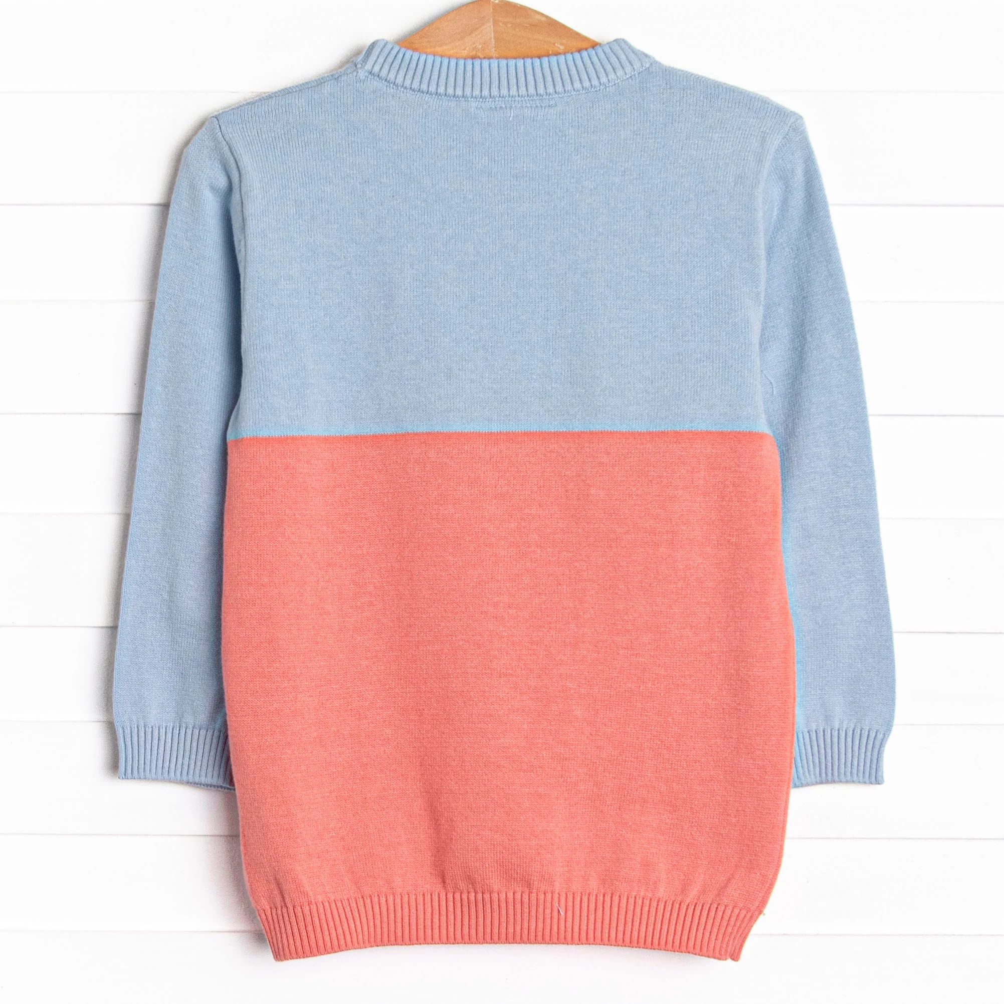Color Block Cutie! This sweater features the coziest knit material, and a light blue and salmon pink colorblock. This sweater is perfect to keep your little one warm in cooler months!