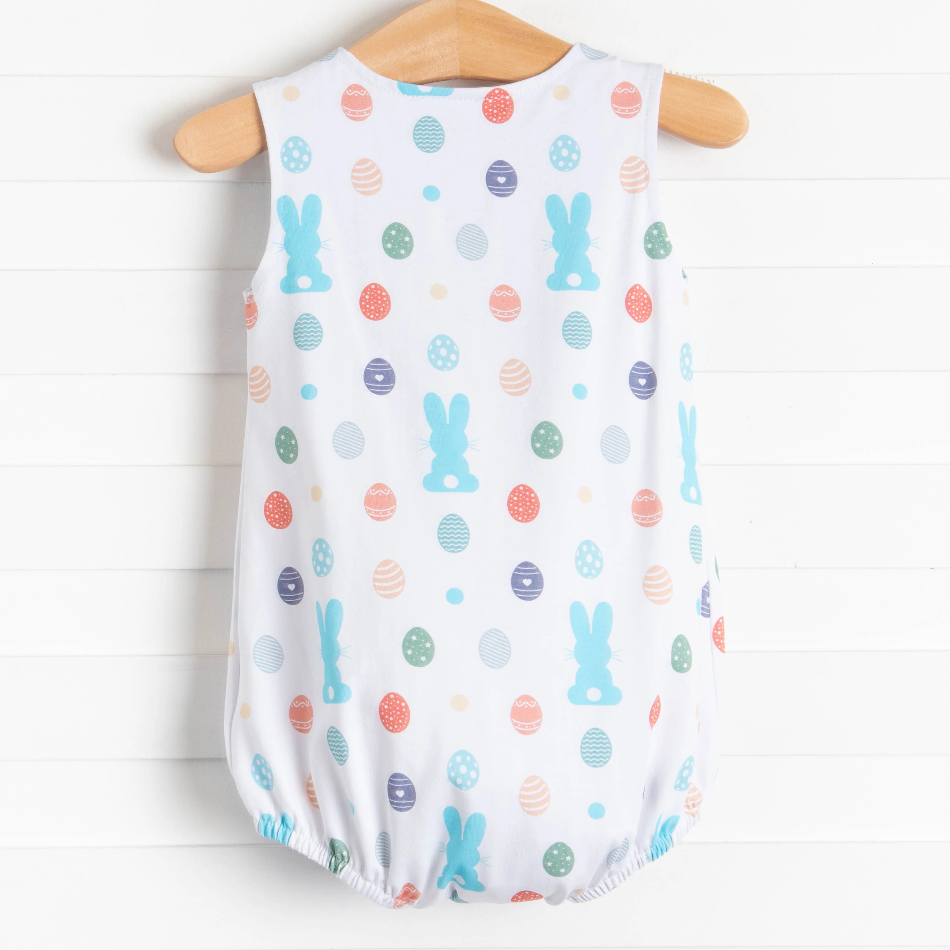 Leave the dye to us this year with this colorful and festive bubble! Features an array of blue bunnies, dots, and decorated Easter eggs. Your little one will be so egg-cited to take on their next adventure in this versatile, knit bubble!
