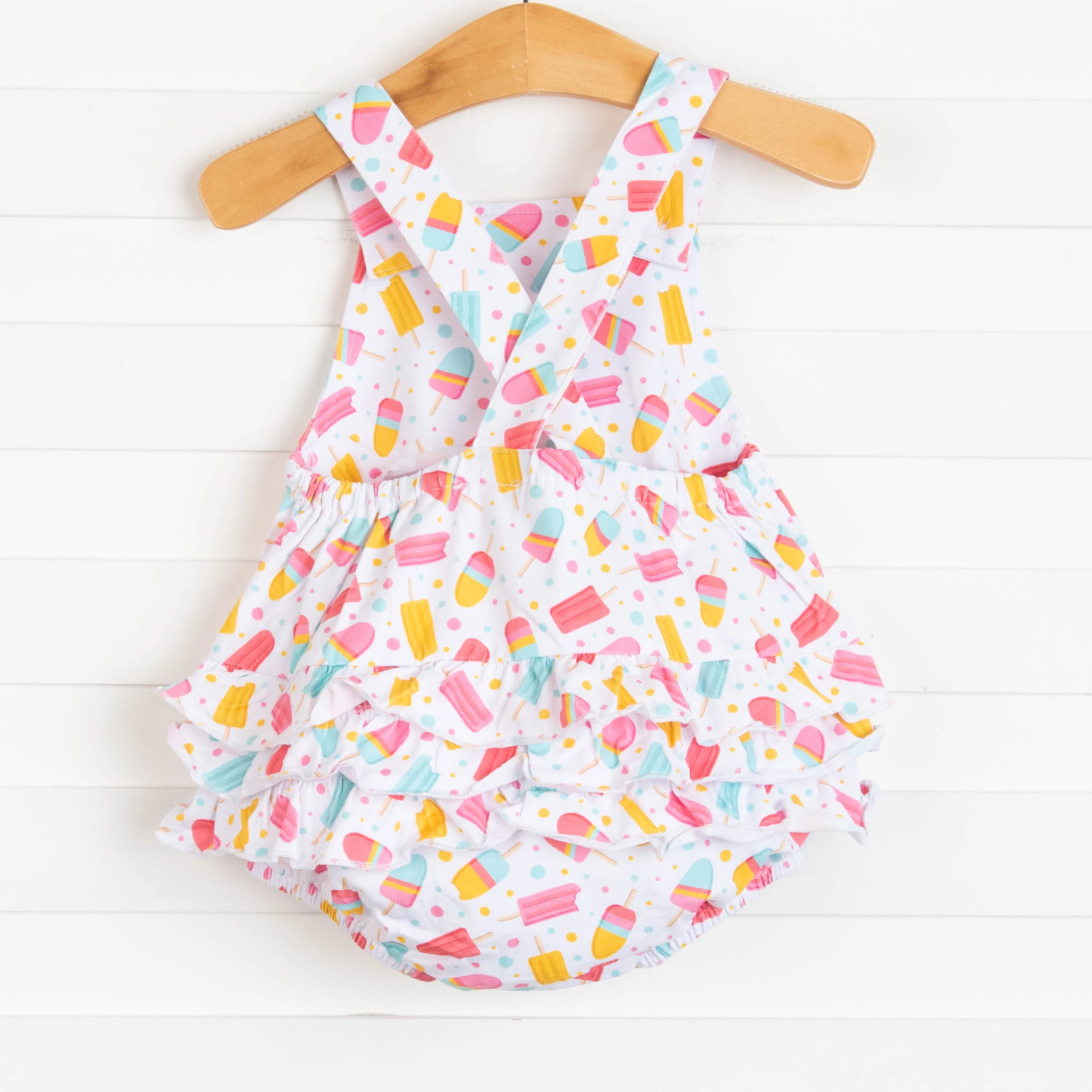 Nothing cooler than a summer treat! This sunsuit features a pretty popsicle print, ruffle on the bottom, and a crisscross back. This is the perfect summer bubble! SIZE GUIDE