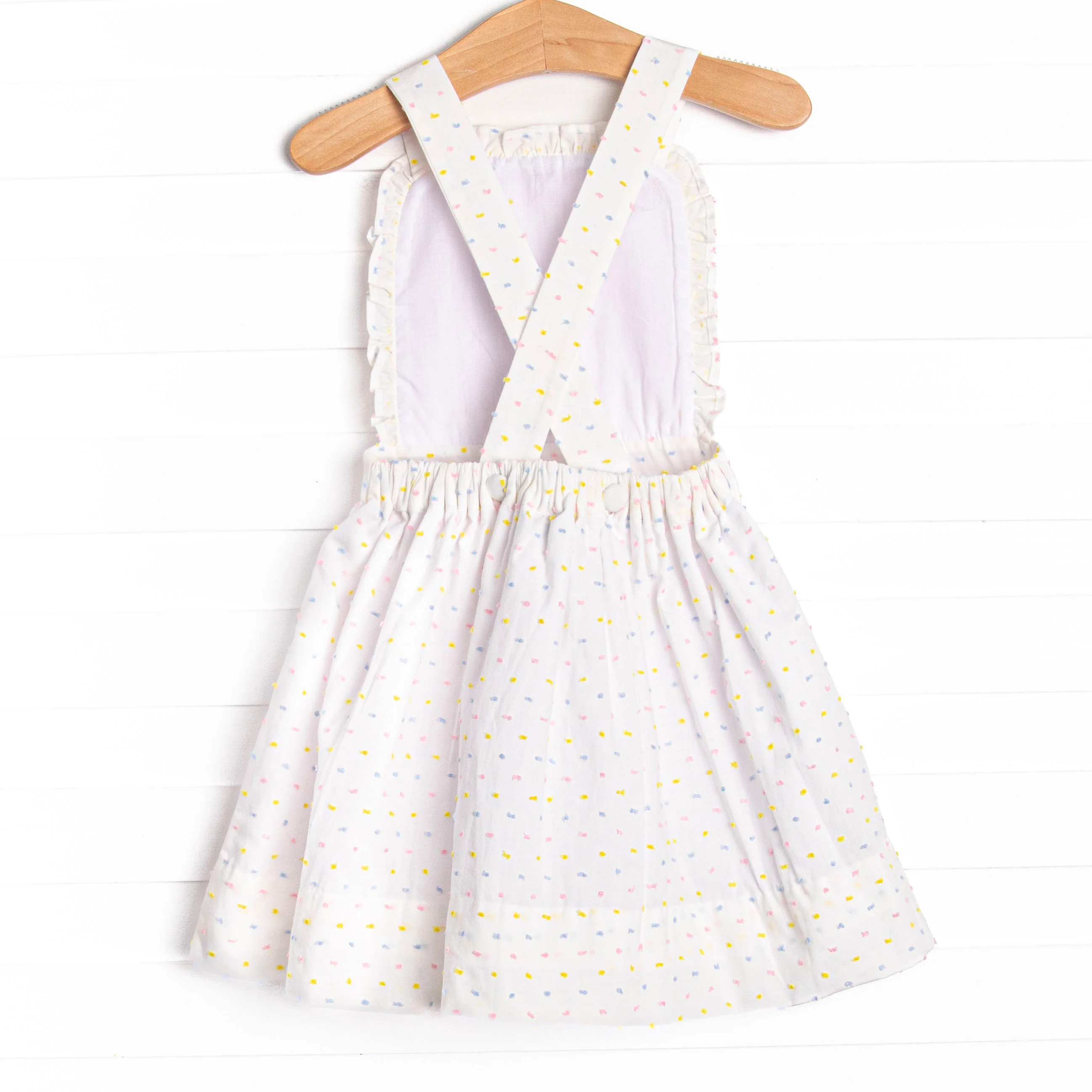 Cutie Criss-cross Colors! This dress features a multi color swiss dot, pink geomatric smocking,, and ruffle trim. This dress is darling!