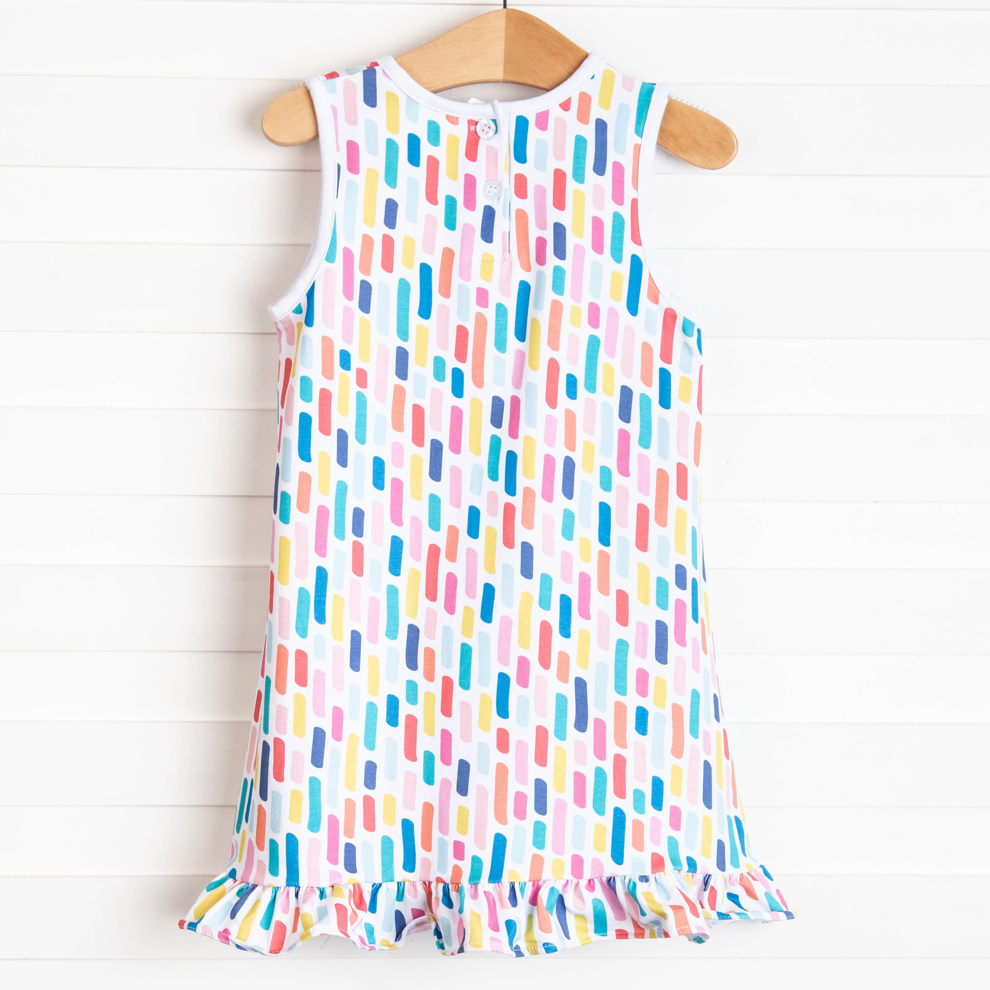 Your little one is going to be a cutie in color! This dress features rainbow brush strokes, white trim, and a ruffle hem. The perfect dress for all of her summer fun! SIZE GUIDE