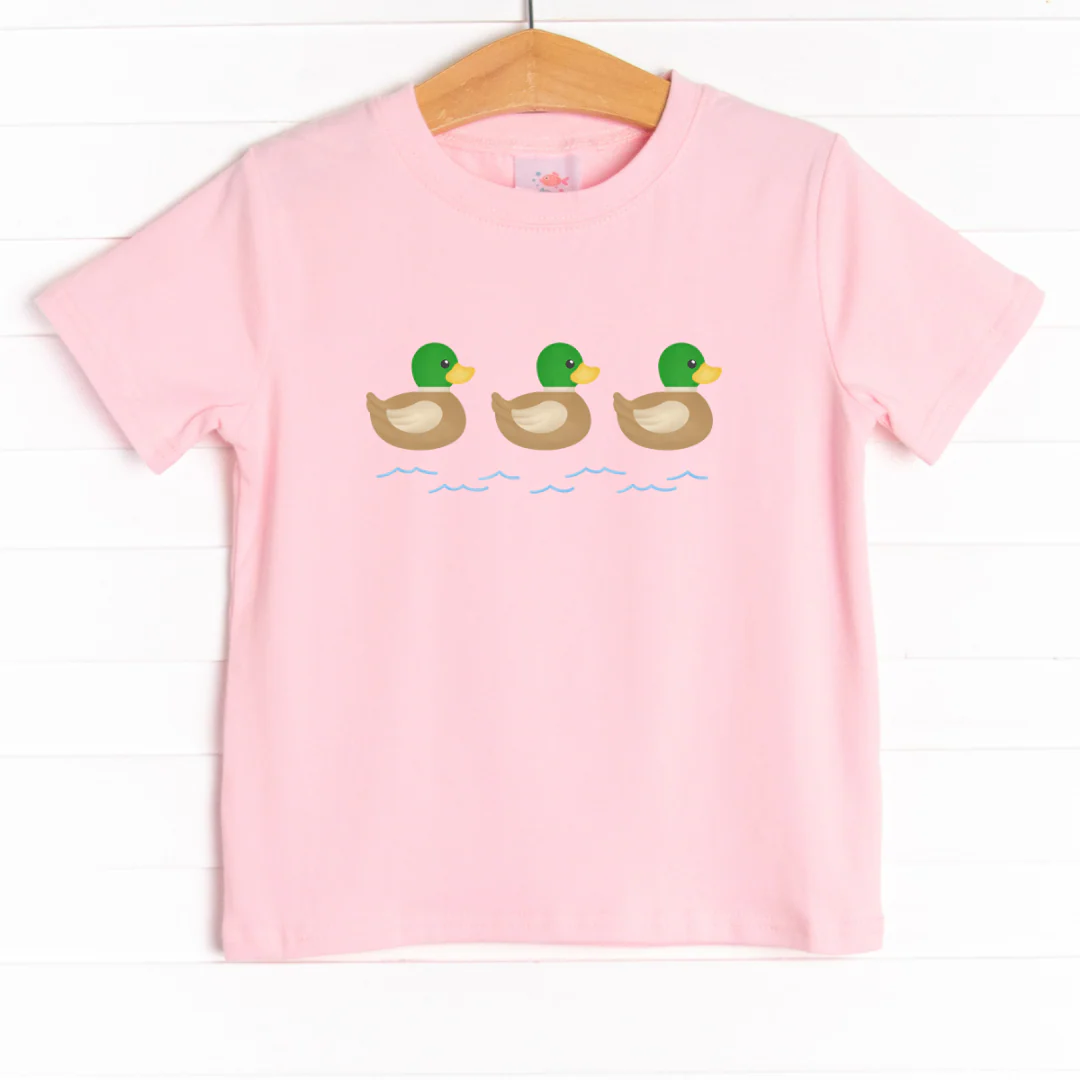 Darling Ducks in a Row! The shirt is featured in four colors: Soft Blue, Heather Gray, Ballerina Pink, and White. Your little one is going to love this soft, breathable shirt for all of their Spring and Summer fun!