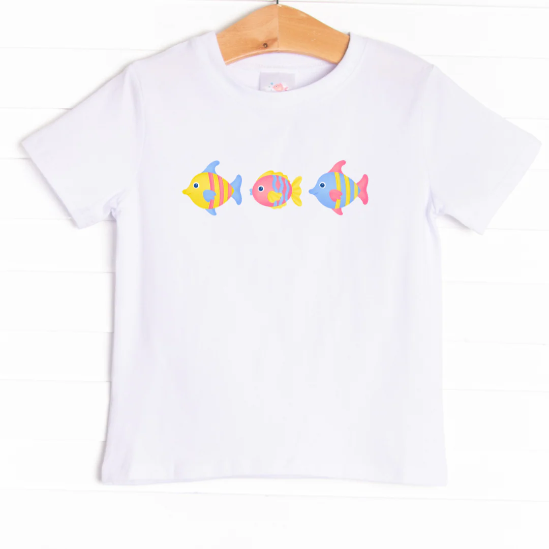 The most fun Fish Friends! The shirt is featured in four colors: Soft Blue, Ballerina Pink, Heather Gray and White. Your little one is going to love this soft, breathable shirt for all of their Spring and Summer fun!