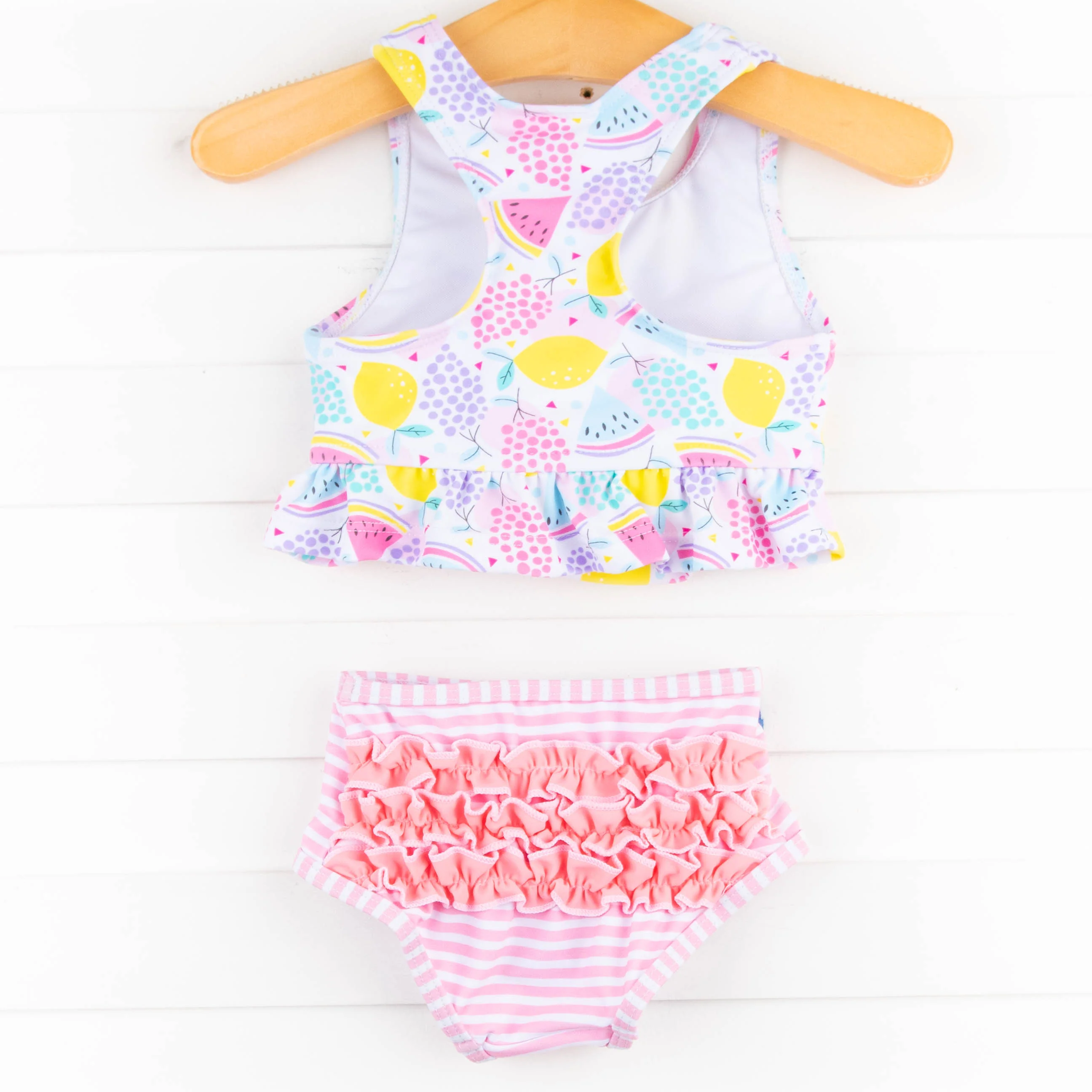 We are diving into Spring and Summer and our new swim styles are here! The bikini features a ruffle bikini top, pink ruffle bottoms, and a fruit inspired print. This swimsuit is perfect for all of her sun-filled days!