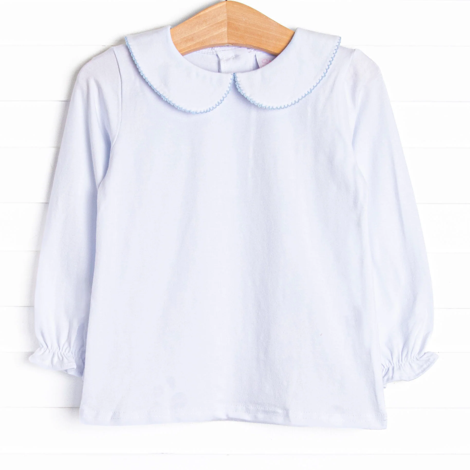 Genevieve, oh how we love your timeless charm and endless versatility! This white, long sleeve beauty is perfectly precious on its own or as a layering basic. A subtle ruffle trim on the sleeves and white, light blue, red, or pink picot trim around the Peter Pan collar is the perfect finishing touch to this top. An essential style for cooler weather.