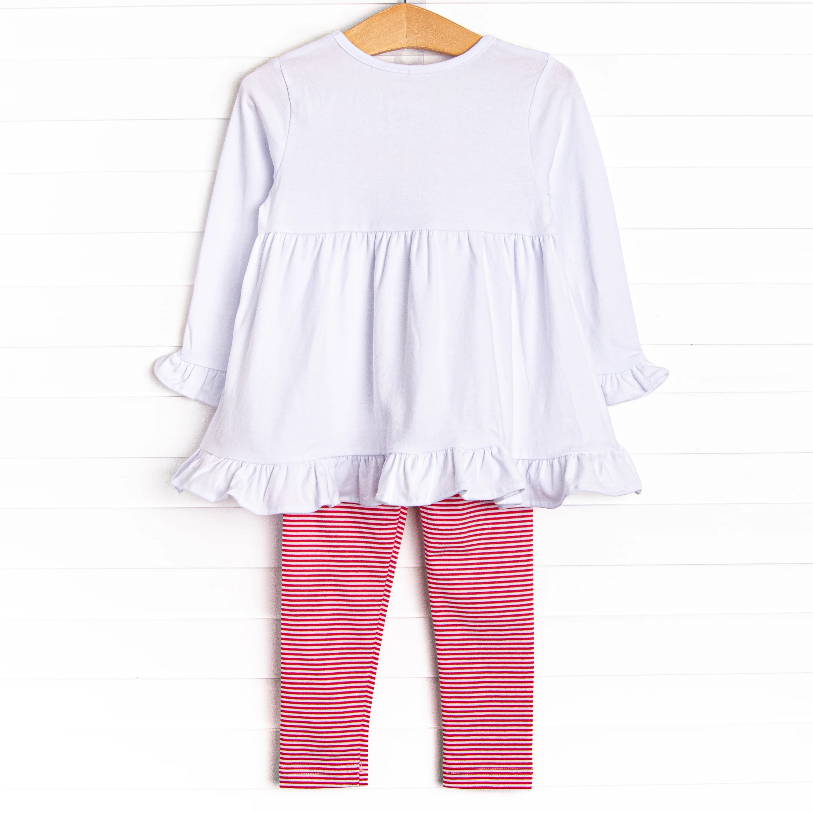 This Legging Set is sure to tug on your heart strings! This precious set features a long sleeve top with ruffle hem details and a heart string applique. Red striped leggings to match. Your heart will be full of love in this set!