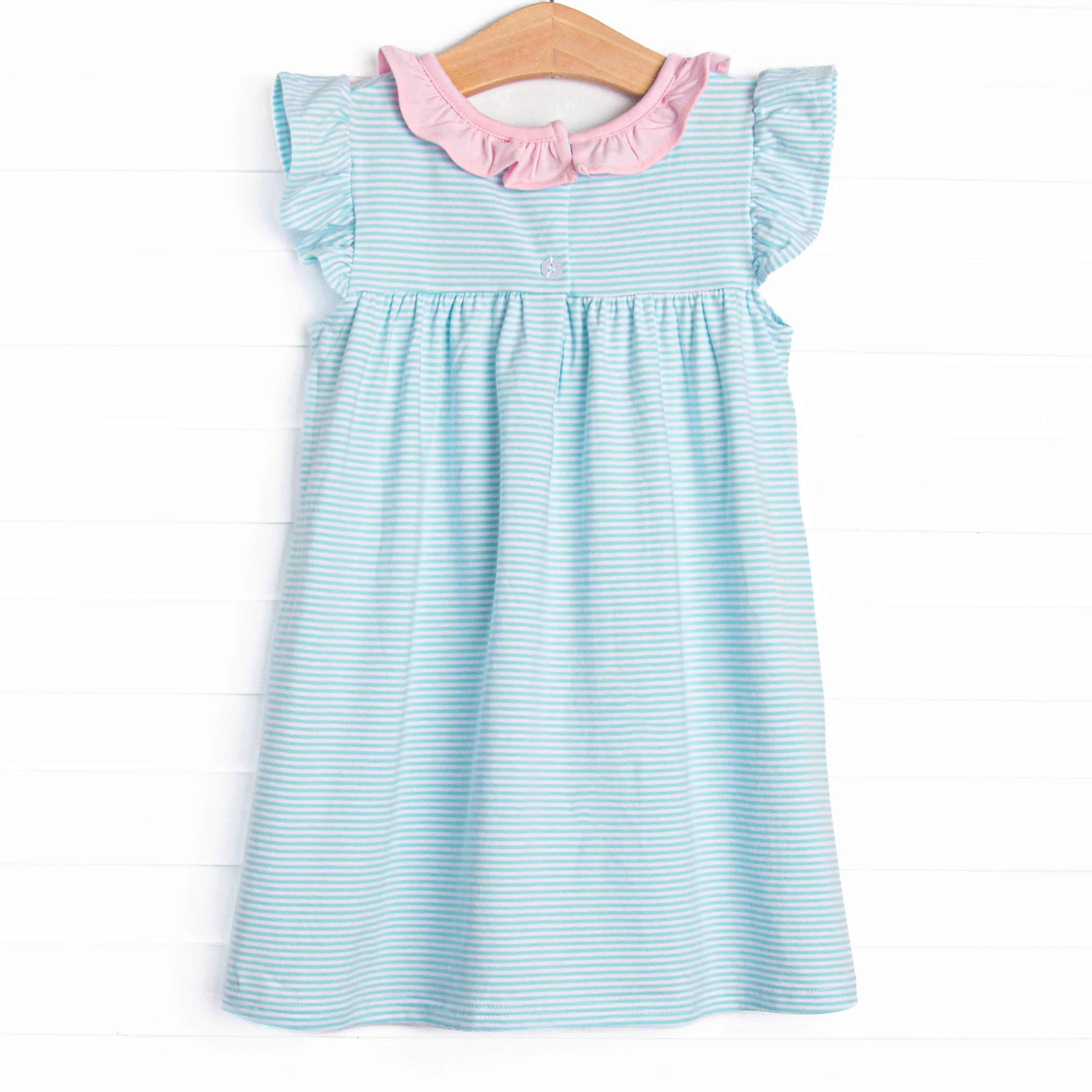 The Jane Flutter Sleeve Dress is an adorable classic! This dress features a precious ruffle collar, sweet aqua blue stripes, and soft knit material. Your little one is going to love this dress!