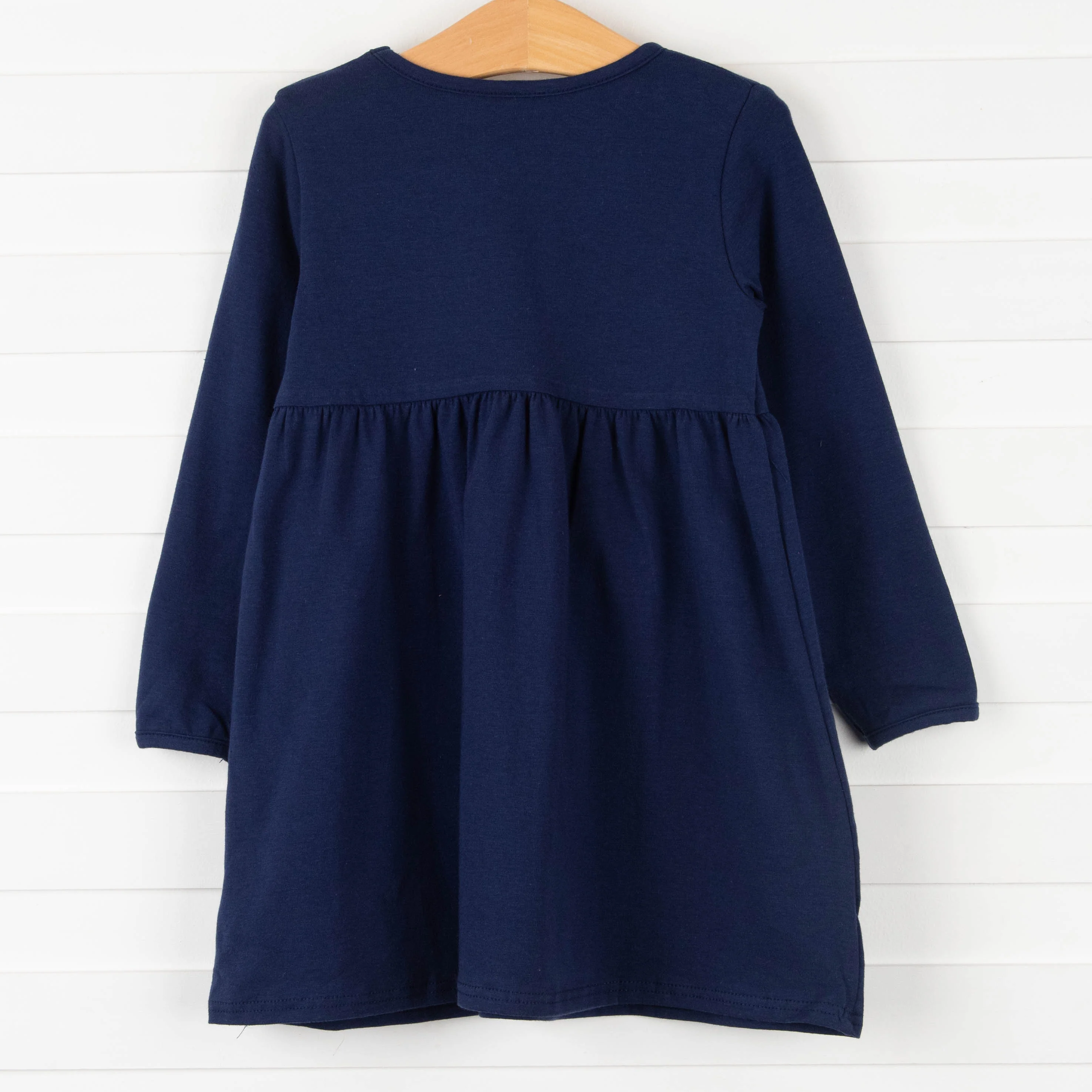 Oh so twirly and all things little girly, the Josie Dress in classic navy makes our heart skip a beat! Vibrant colorful dot trim, ruffles at the pockets and piping at the waist are lovely finishing details to this darling dress. Josie is sure to garner all the compliments! SIZE GUIDE