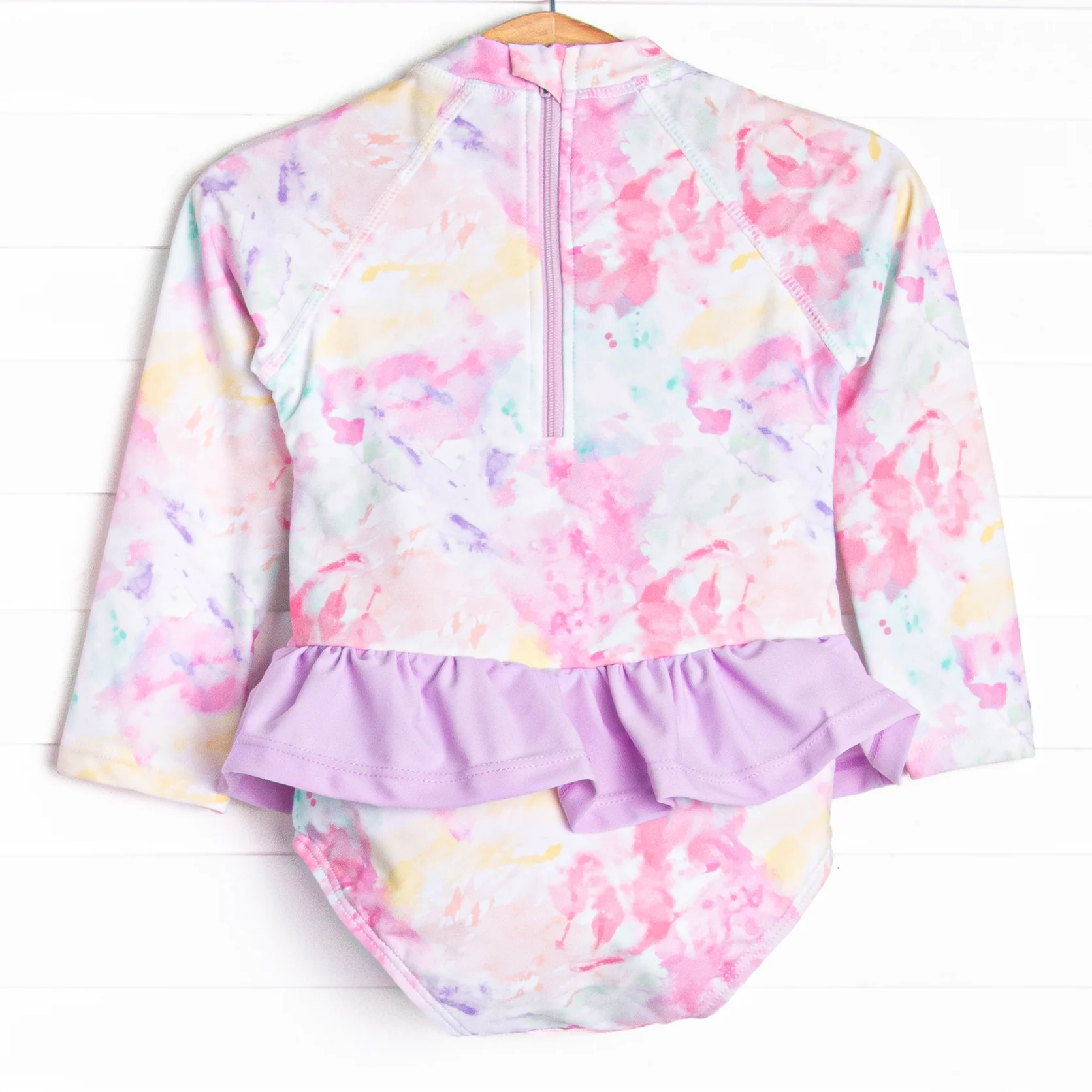 Looking cool in Kaleidoscope Views! The rashguard features a long sleeves for maximum sun protection, a bottom ruffle, and a purple tie dye print. Your beach loving little one will be swimming with style in this one piece!