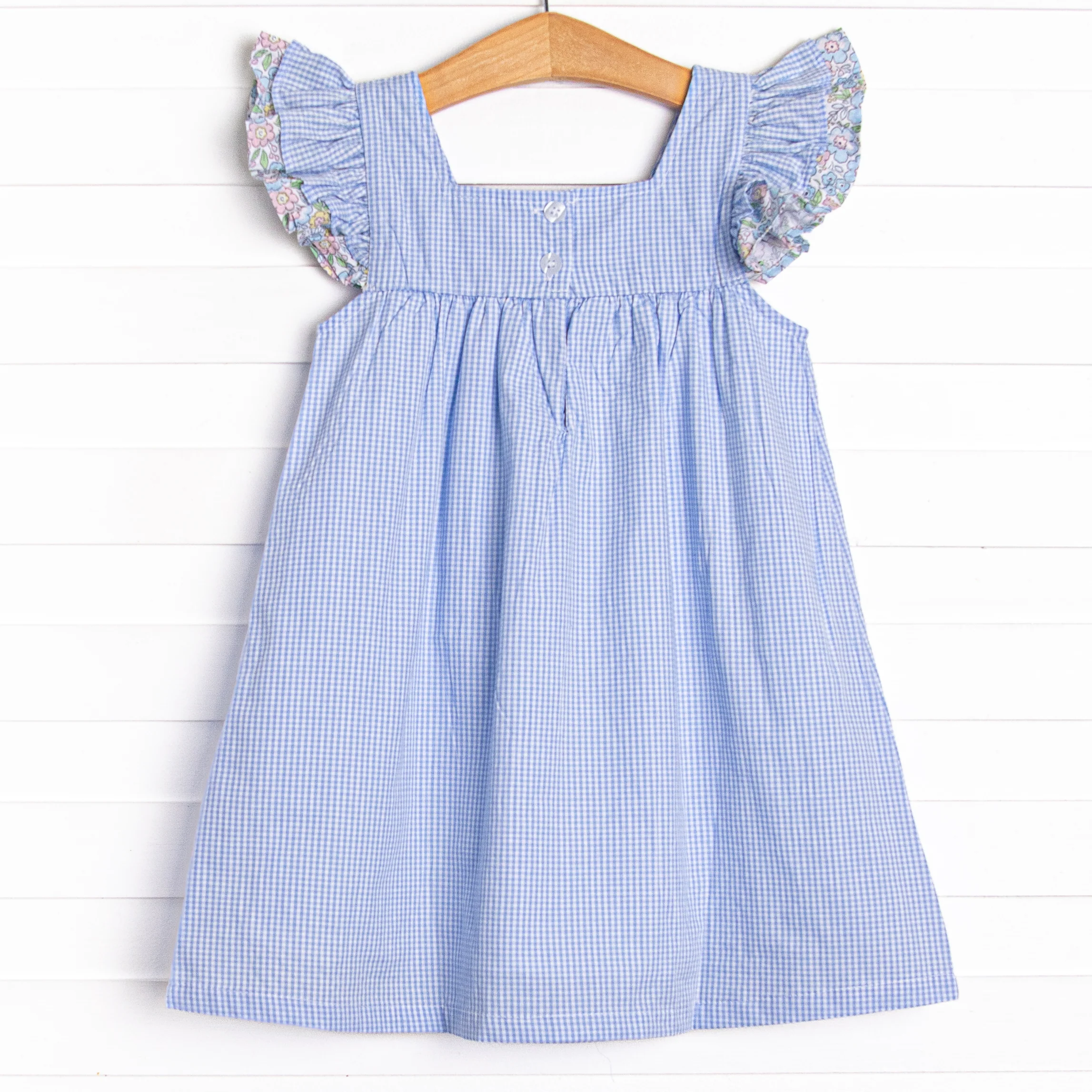 These new styles will be her main squeeze! This dress features a blue gingham print, flutter sleeves with floral ruffle trim, and a gingham lemon applique. Your little one will look too cute in this dress!