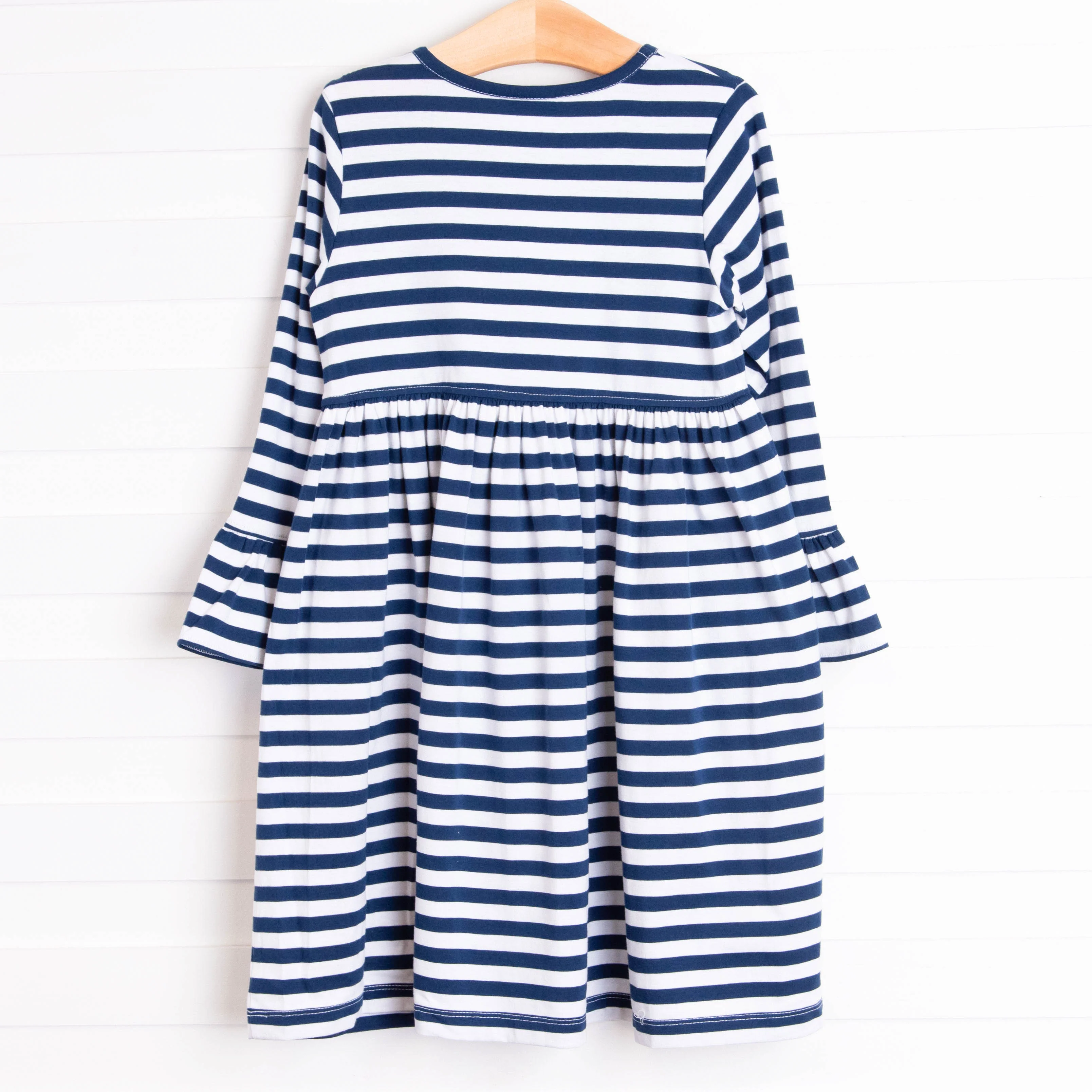 Little Miss Turkey! This dress is featured in a navy stripe, ruffled long sleeve with an adorable turkey applique at the hem. SIZE GUIDE