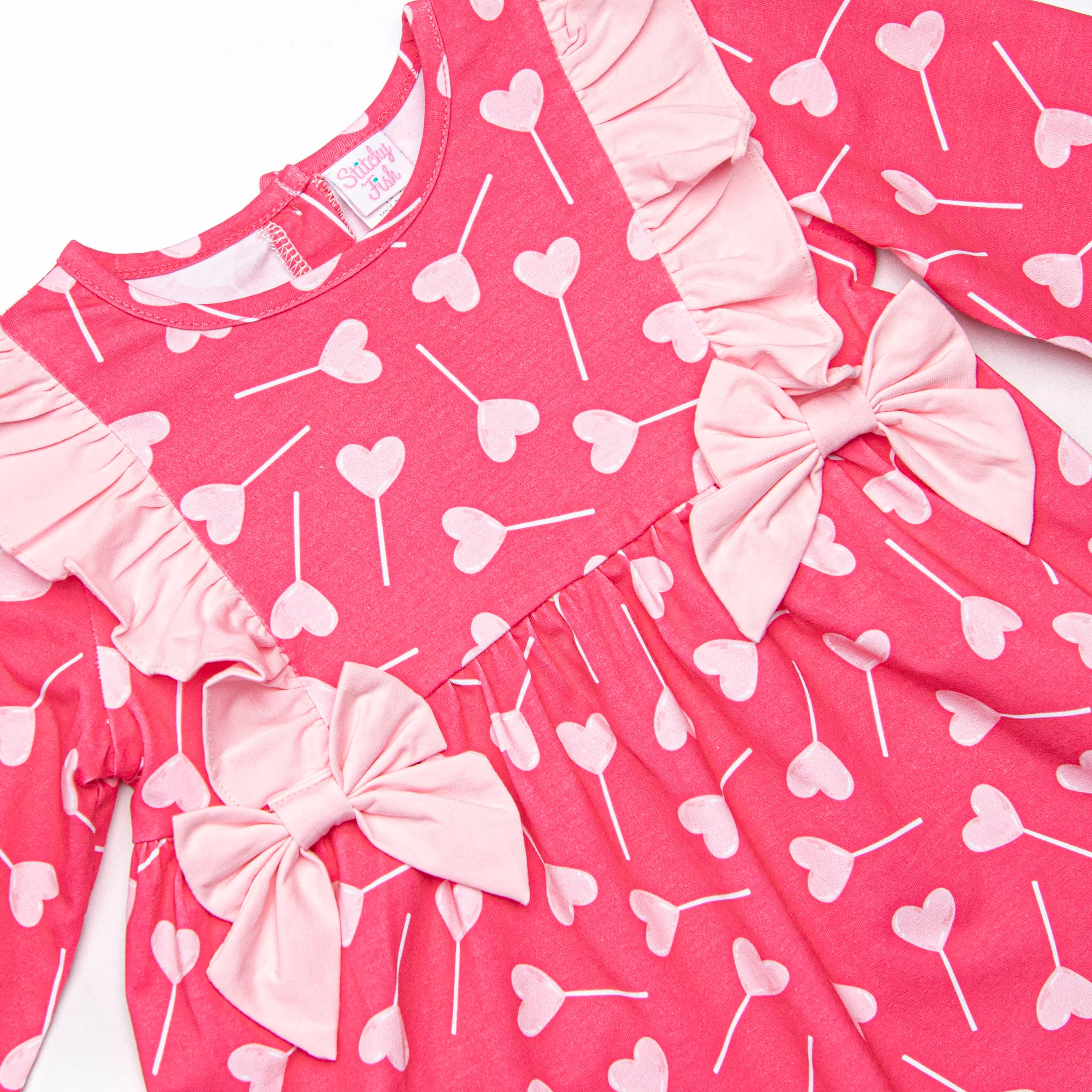 Lots of Love Lolly! This dress features a heart lollipop print, pink bows, and ruffle trim. This dress is too sweet!