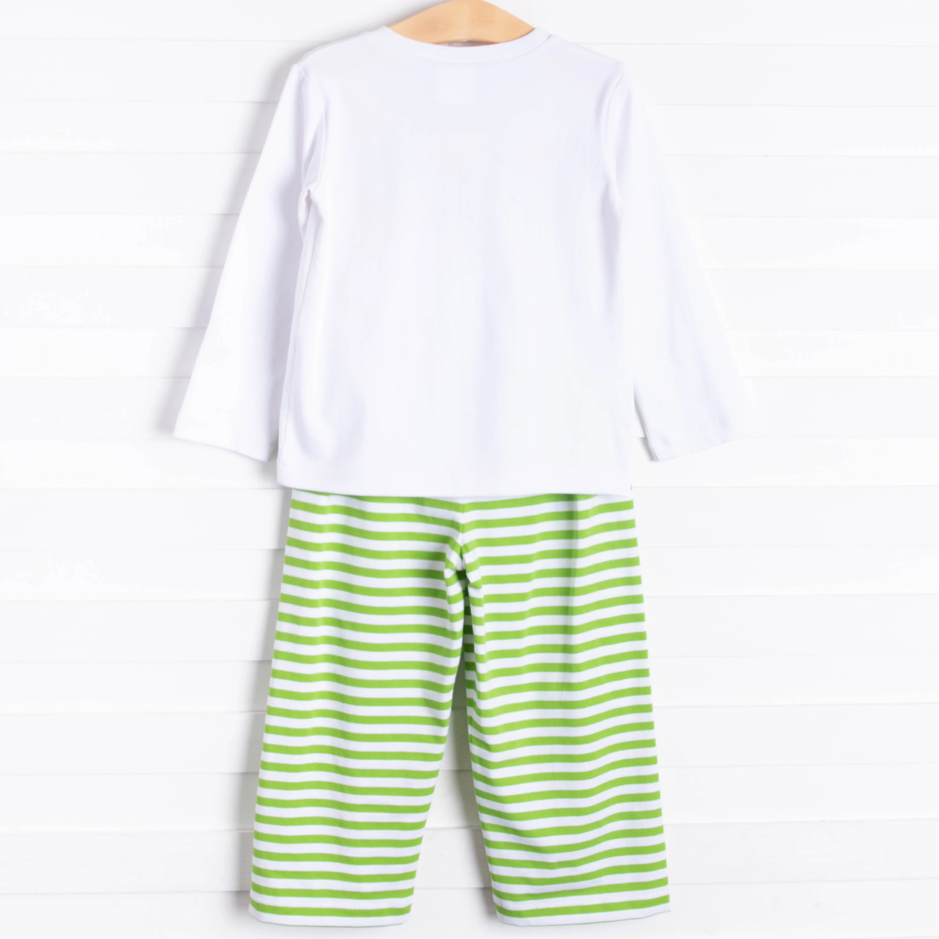 Your little pot of gold will get all the luck and the love in this adorable pant set! White, long-sleeve shirt features an applique pot of gold, four leaf clover, and horseshoe across the chest. Matching green stripe pull on pants will have him feeling like every day is his lucky day! SIZE GUIDE