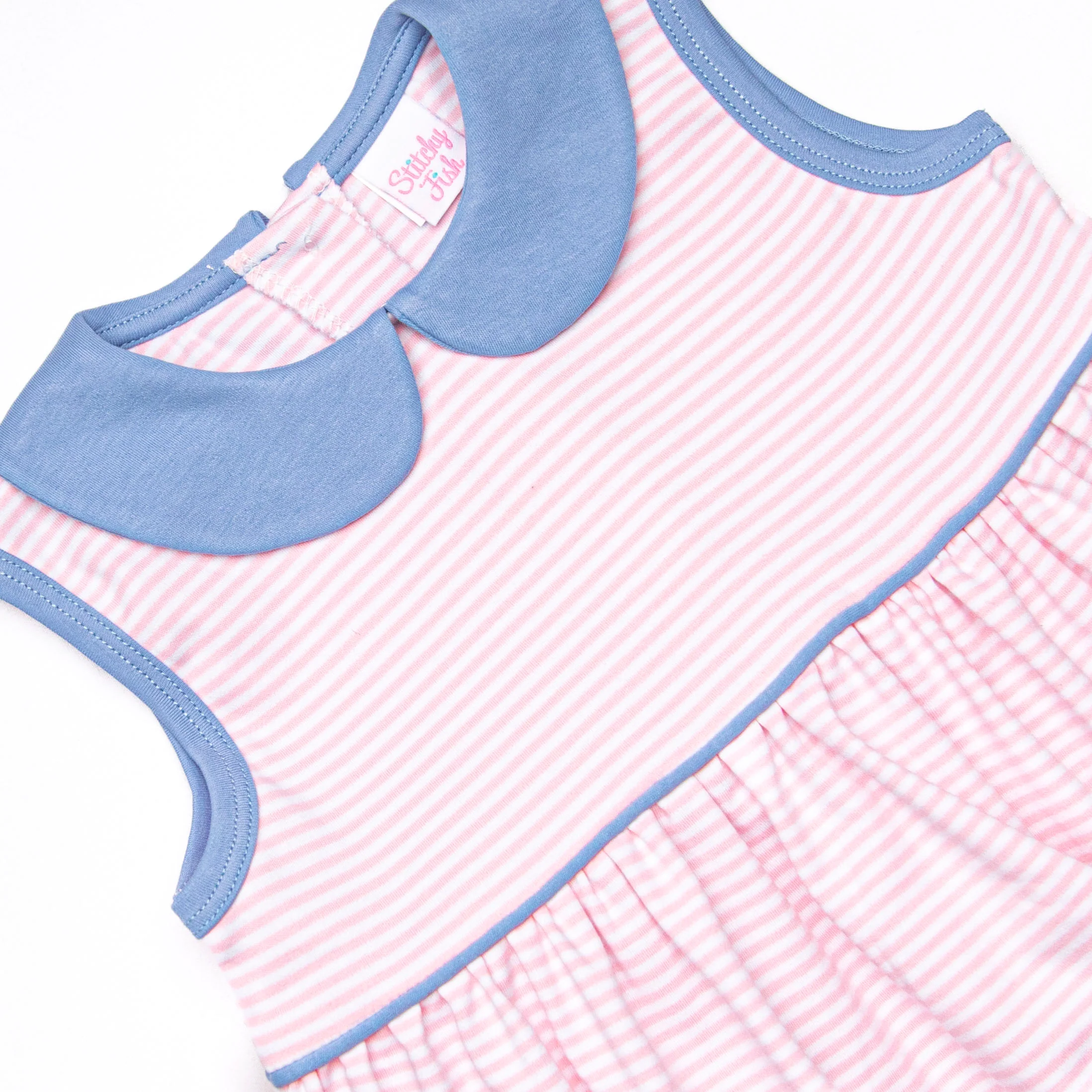 The sleeveless Marcella dress pairs light pink stripes with a pretty blue Peter Pan collar and matching piping. Made of 100% Pima cotton, this cute and comfy dress is perfect for playtime or anytime! Sleeveless, striped dress with snaps at the neck.