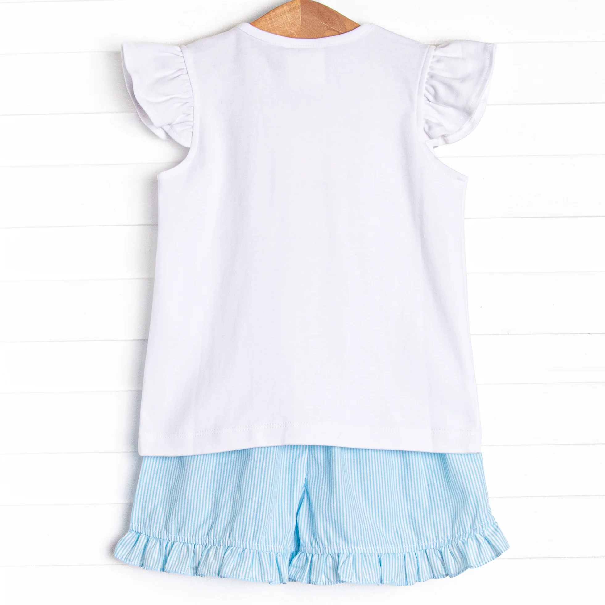How cute are these Marine Mammals! This set features a flutter sleeve top with a trio of whale smockings and aqua blue striped ruffle shorts to match. This set is the set of the Summer!