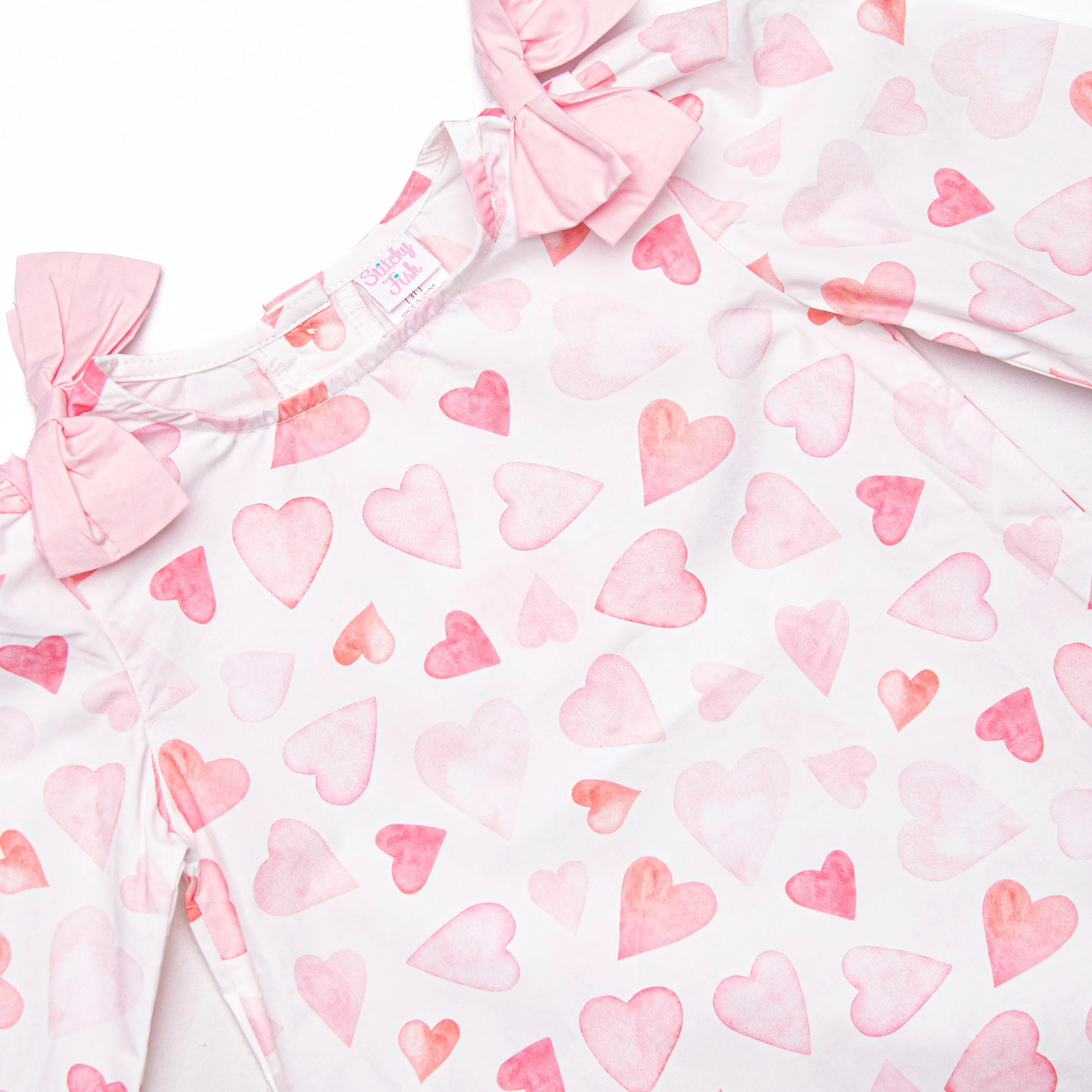 Paint My Love! This dress features a heart print, bows on the shoulders, and button closure on the back. This dress is too cute!