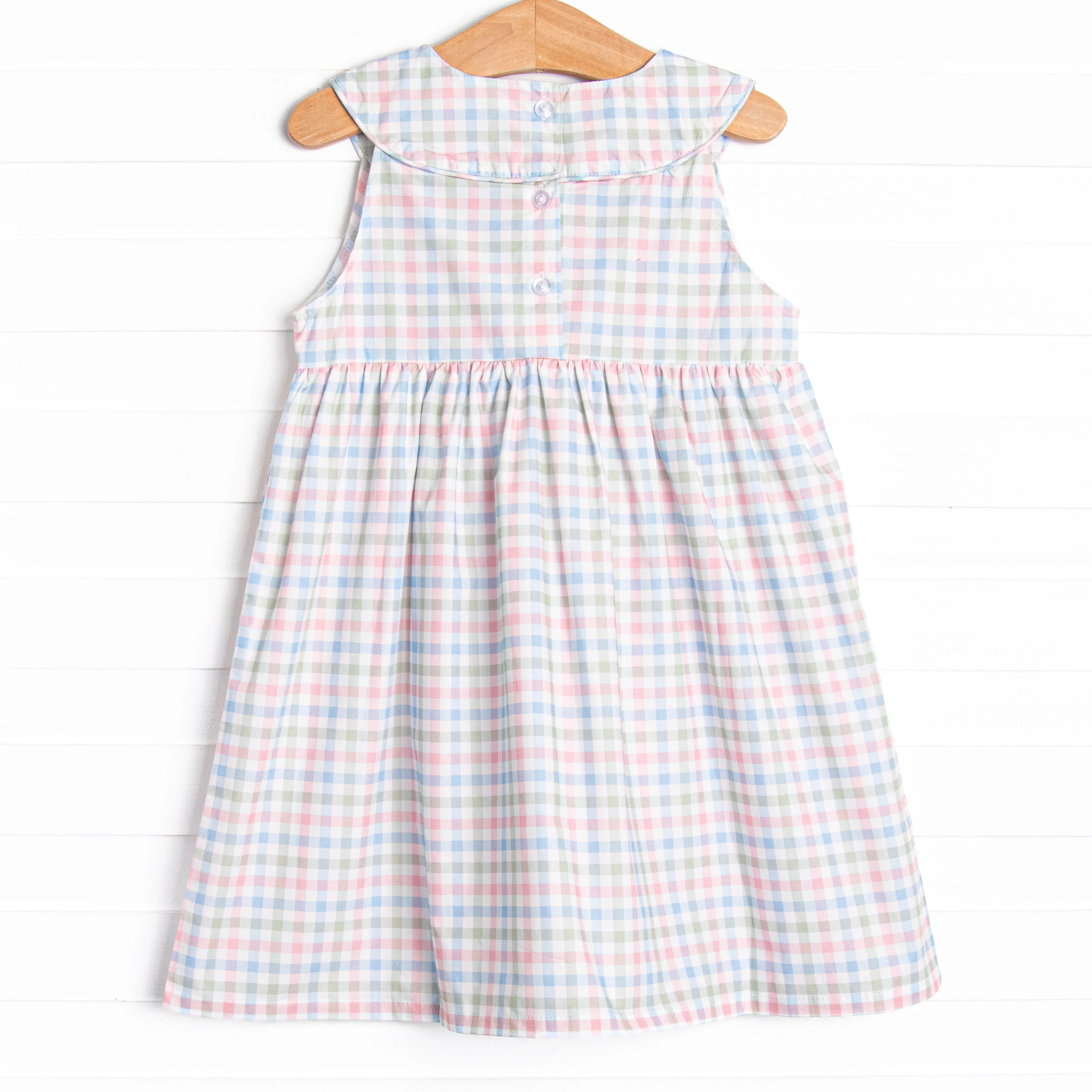 The prettiest Paradise Plaid! This dress features a pastel plaid print, a bib collar, and blue trim. This dress is precious!