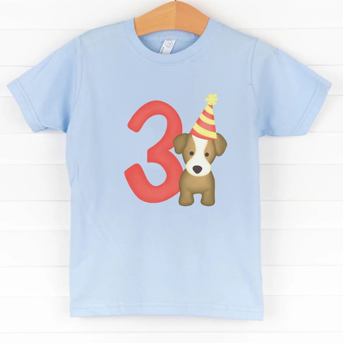 Celebrate their 3rd birthday in style with our new adorable birthday themed graphic tees! The shirt is featured in three colors; White, Heather Gray, and Soft Blue with an adorable celebrating pup graphic. This shirt is perfect for your party pup!