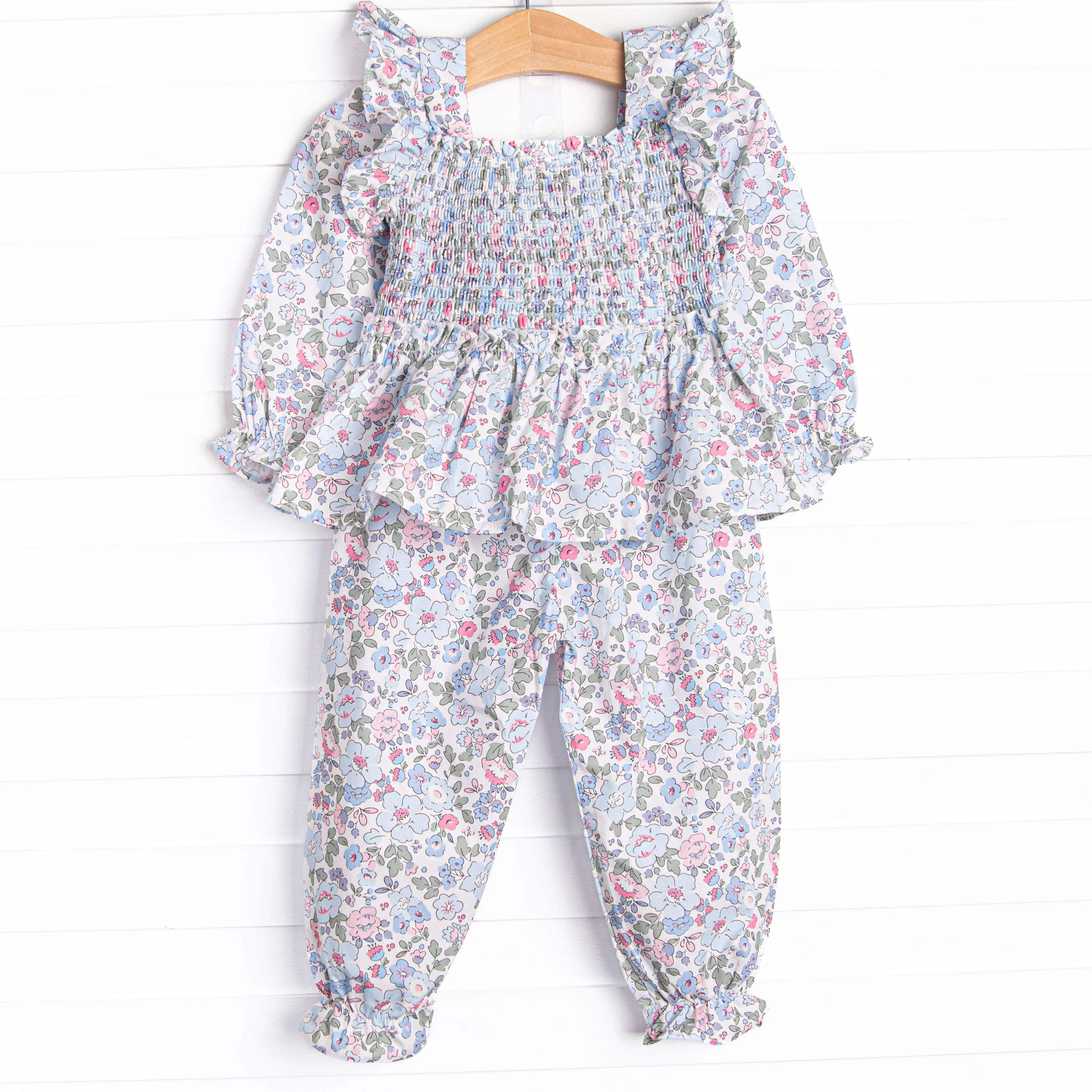 She will look pretty in Petals in the Park! This set features a top in blue floral print with smocking across the chest and ruffle trim on the shoulders. Matching floral pants with drawstring and ruffle hem. This set is just too fun!