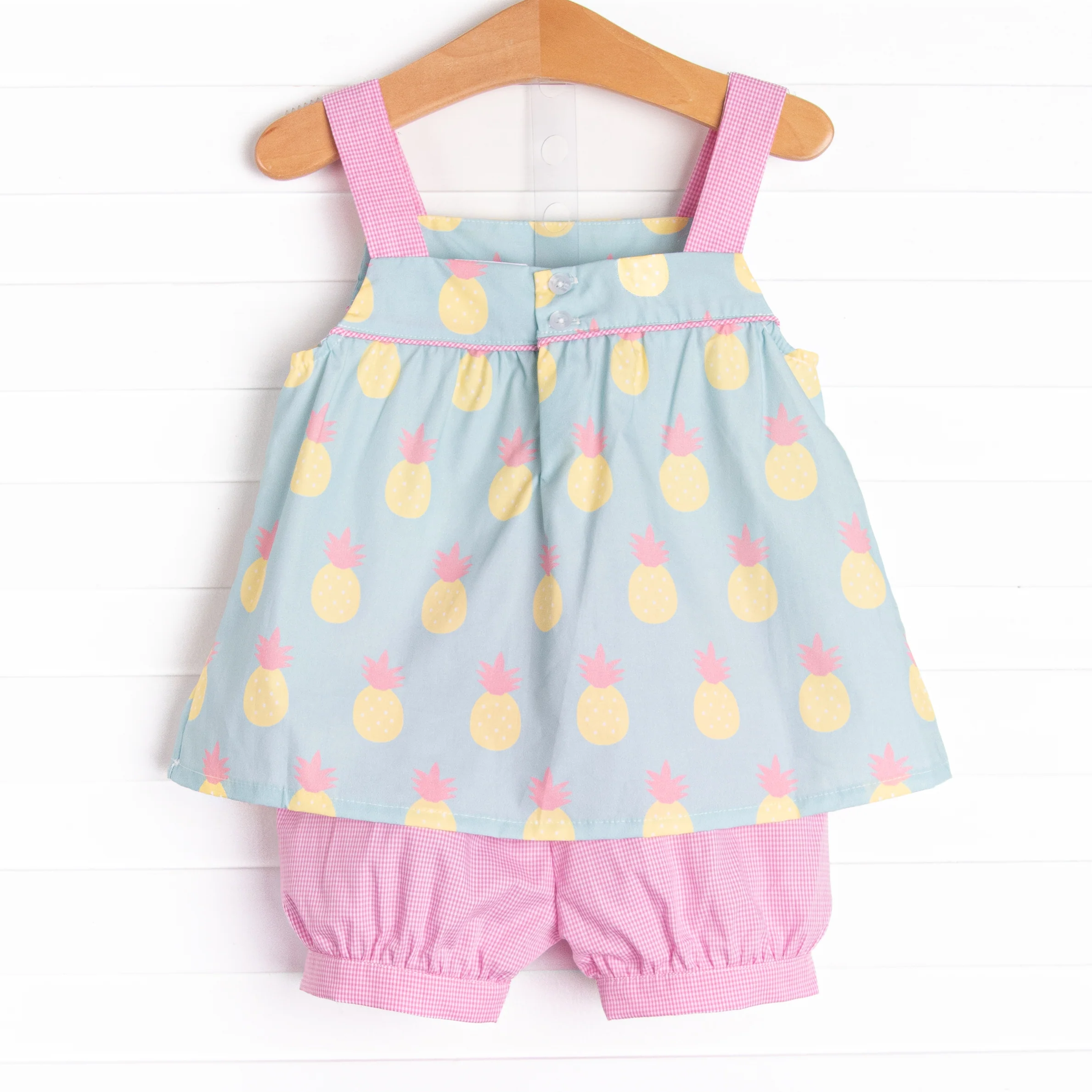 She will look pretty in Pineapple Paradise! This set features a top with pink gingham straps and a pineapple print. Pink mini gingham shorts to match. She will have the sweetest summer in this set!