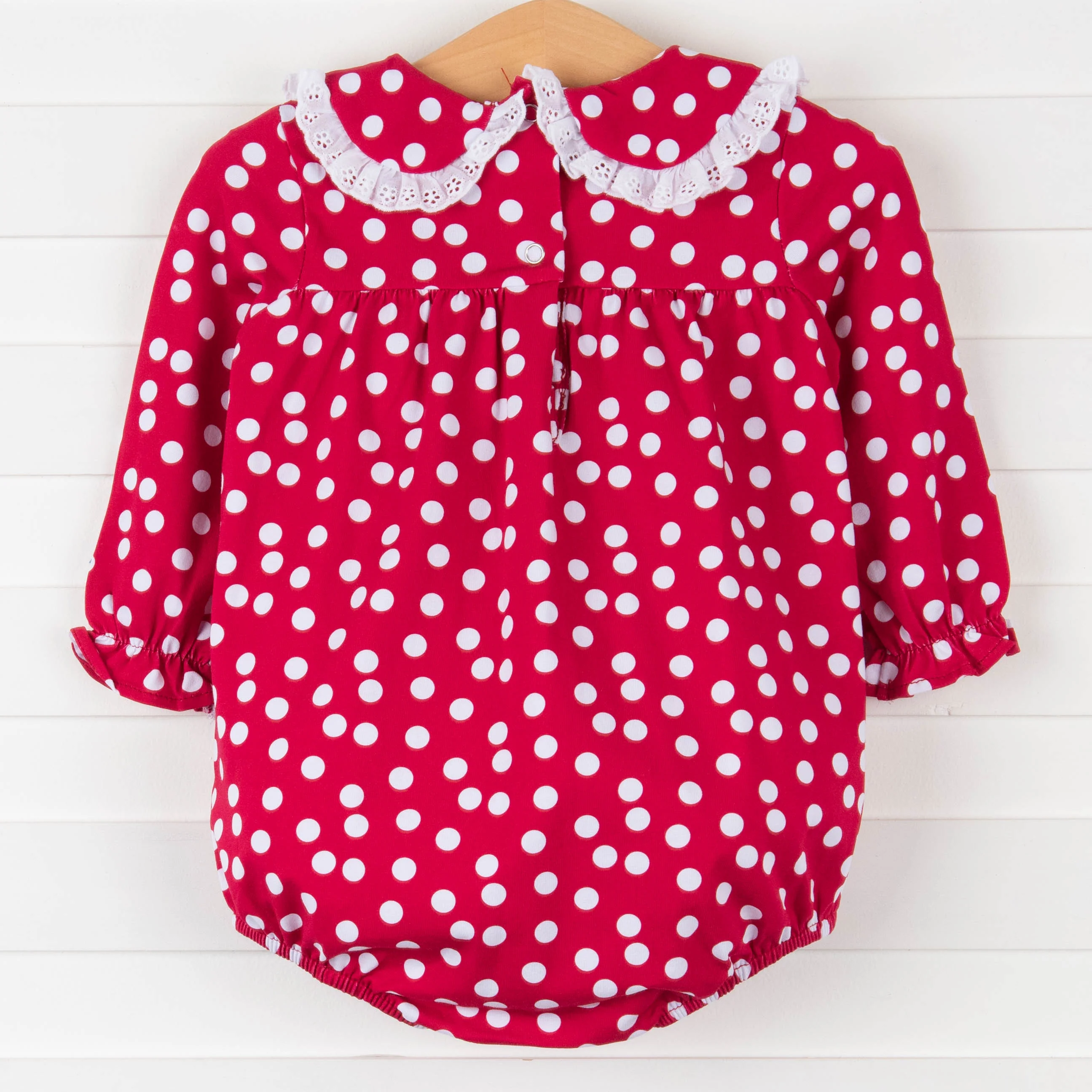 Your little girl will look ravishing in red dots! This bubble features eyelet trim around the collar, buttons in the back, and snaps in the stride. She will be feeling cute and cozy in this rosy addition! SIZE GUIDE