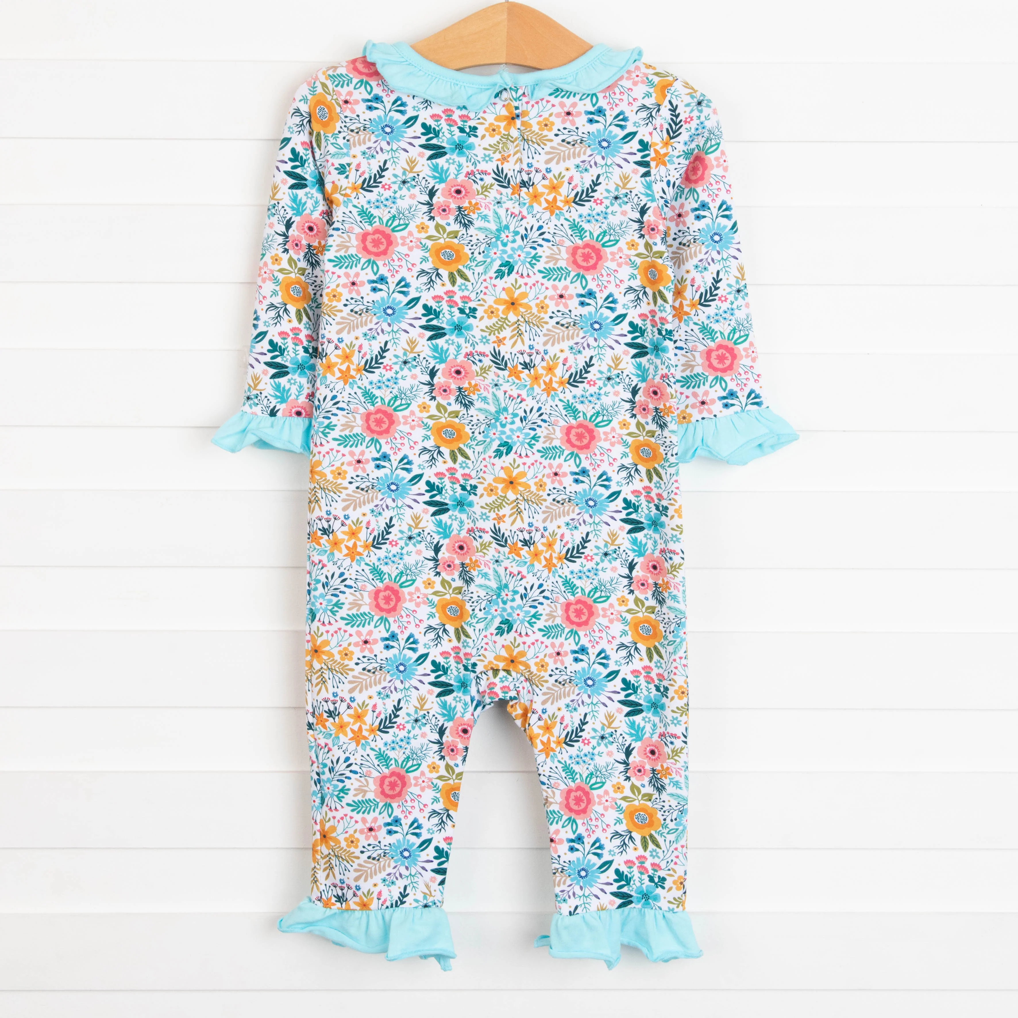 A super sweet romper that is absolutely perfect for the season! The Rylie Romper is featured in an adorable blue and yellow floral print with long sleeves, a solid aqua ruffle collar and hem. Perfect for play time or any time! SIZE GUIDE