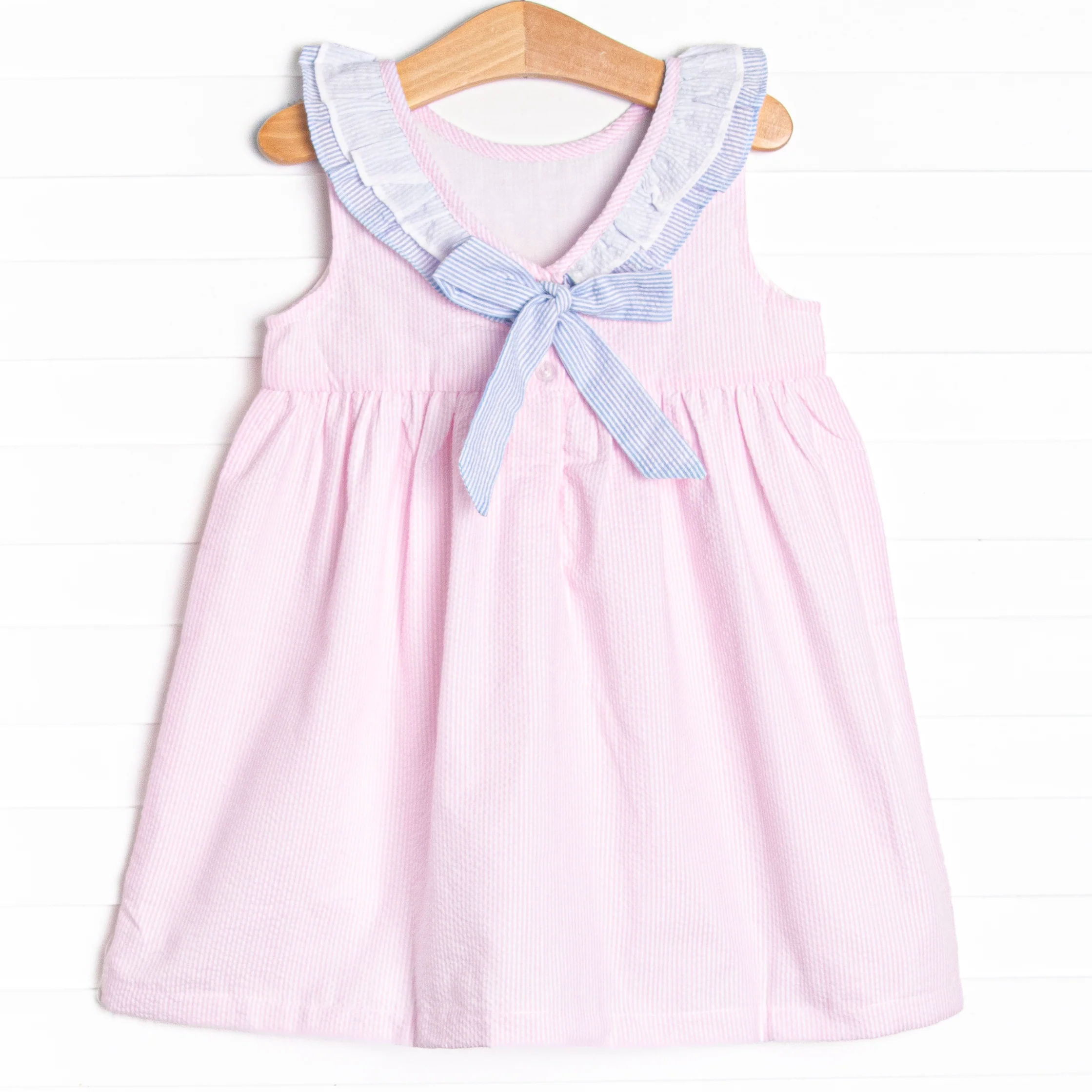 She will look so cute in Seaside Seersucker! This dress features a pink seersucker print, seersucker ruffle trim, and a bow on the back. This is the perfect dress for summer!