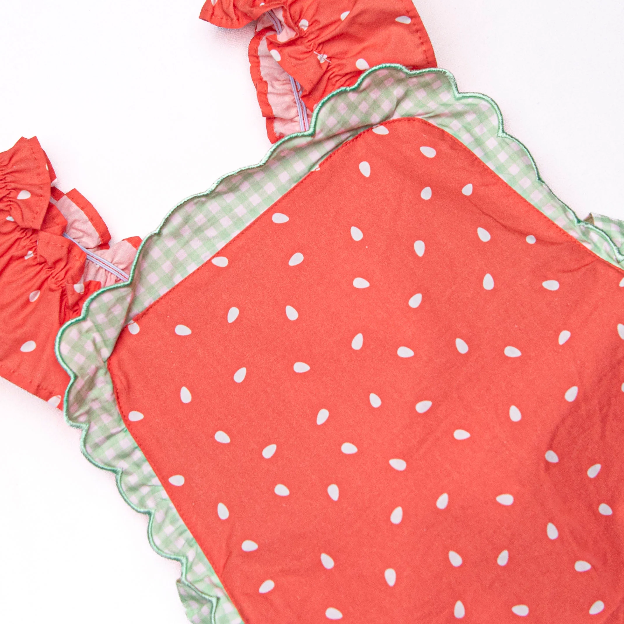 Springtime Sweetness! This dress features a watermelon seed print, green gingham ruffles, and a bow on the back. This dress is too cute!