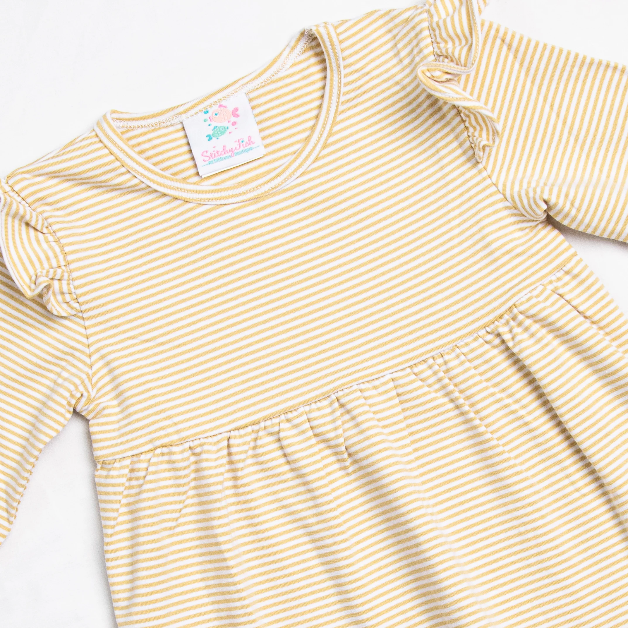 Your little one will be the star of the show in this bloomer set! This set features a long sleeve top in a gold stripe print in the softest knit material with ruffle details on the shoulders. Coordinating bloomer shorts in the cutest star print to match. This adorable set deserves a gold star!