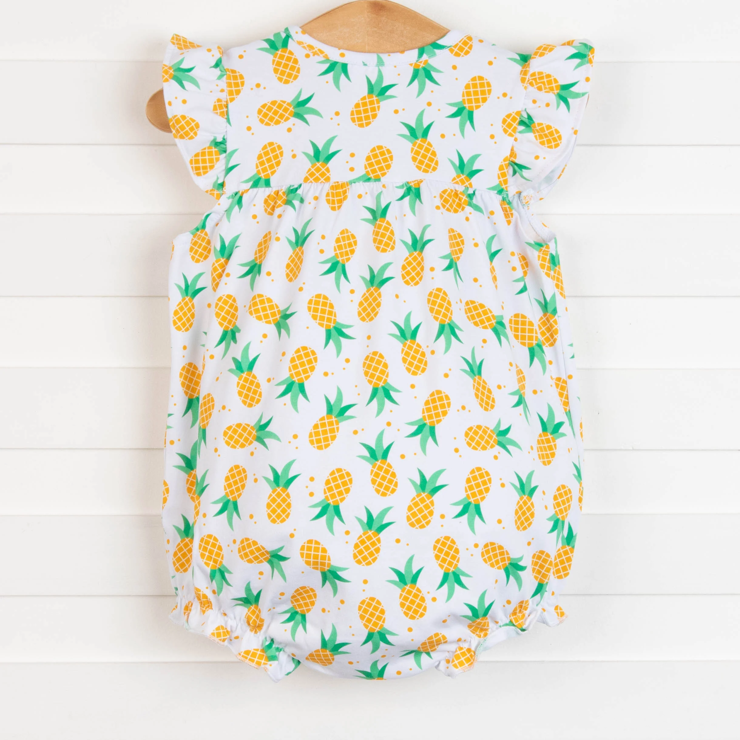 Sweet on the inside and cute on the outside! This bubble features snaps down the front and in the stride, flutter shoulders, and the cutest pineapple print. This is a summer must have! SIZE GUIDE