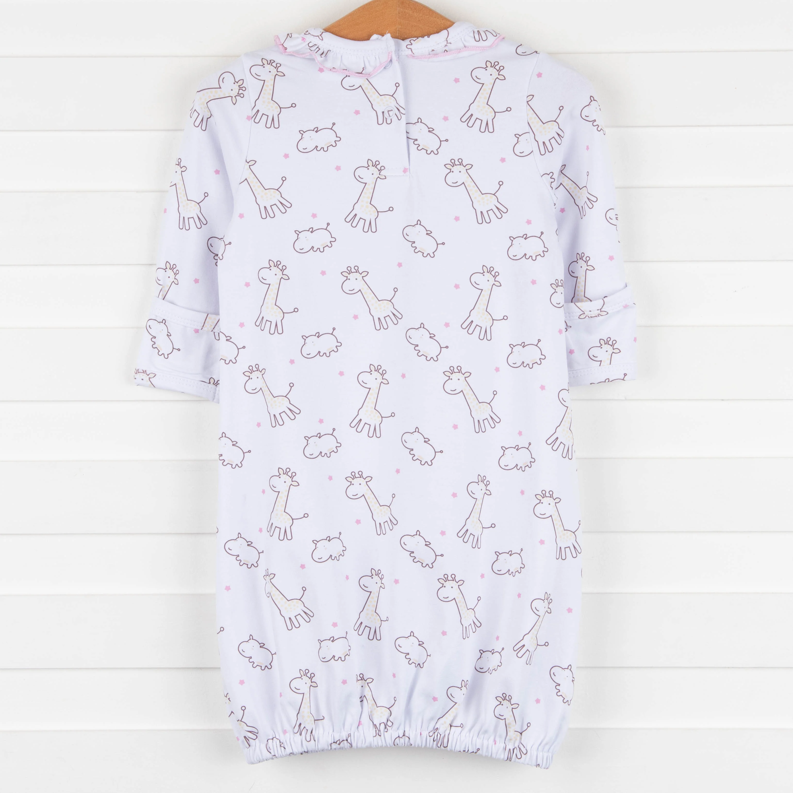 Whether tall or small this is bound to be your baby's favorite gown! It features fold over cuffs to prevent accidental scratching, snaps in the back, and elastic opening to make changing a breeze. The adorable giraffe and hippo print is just the icing on the cake!