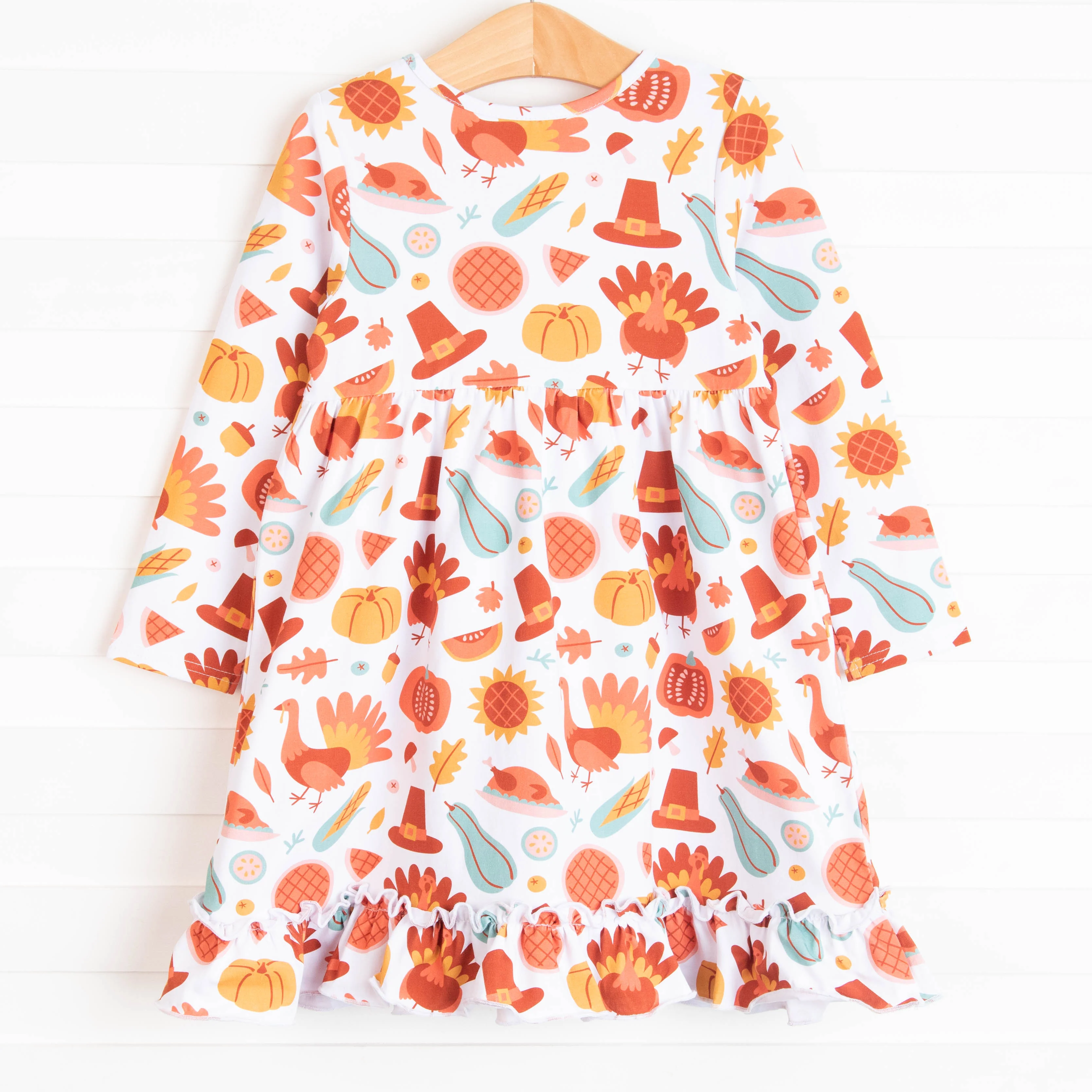 This Thanksgiving Favorites Dress is absolutely adorable! It is featured in long sleeves in a variety of Thanksgiving favorites print and sweet ruffle hem! Perfect for all your Fall activities! SIZE GUIDE