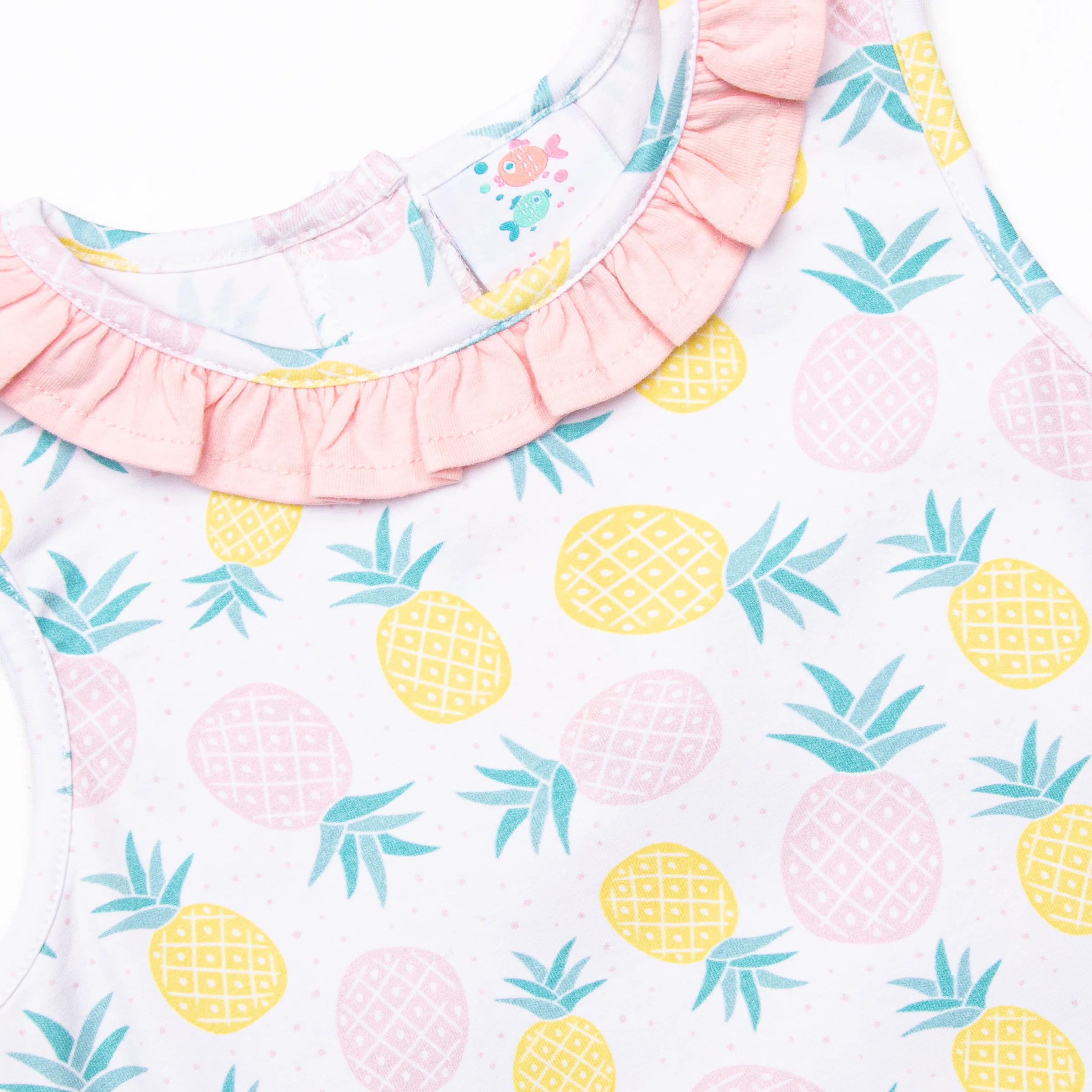 Bring on the Tropical Breeze! This dress features a pastel pineapple print, a pink ruffle collar, and the softest knit material. Your little one will be the pine-apple of your eye in this dress!