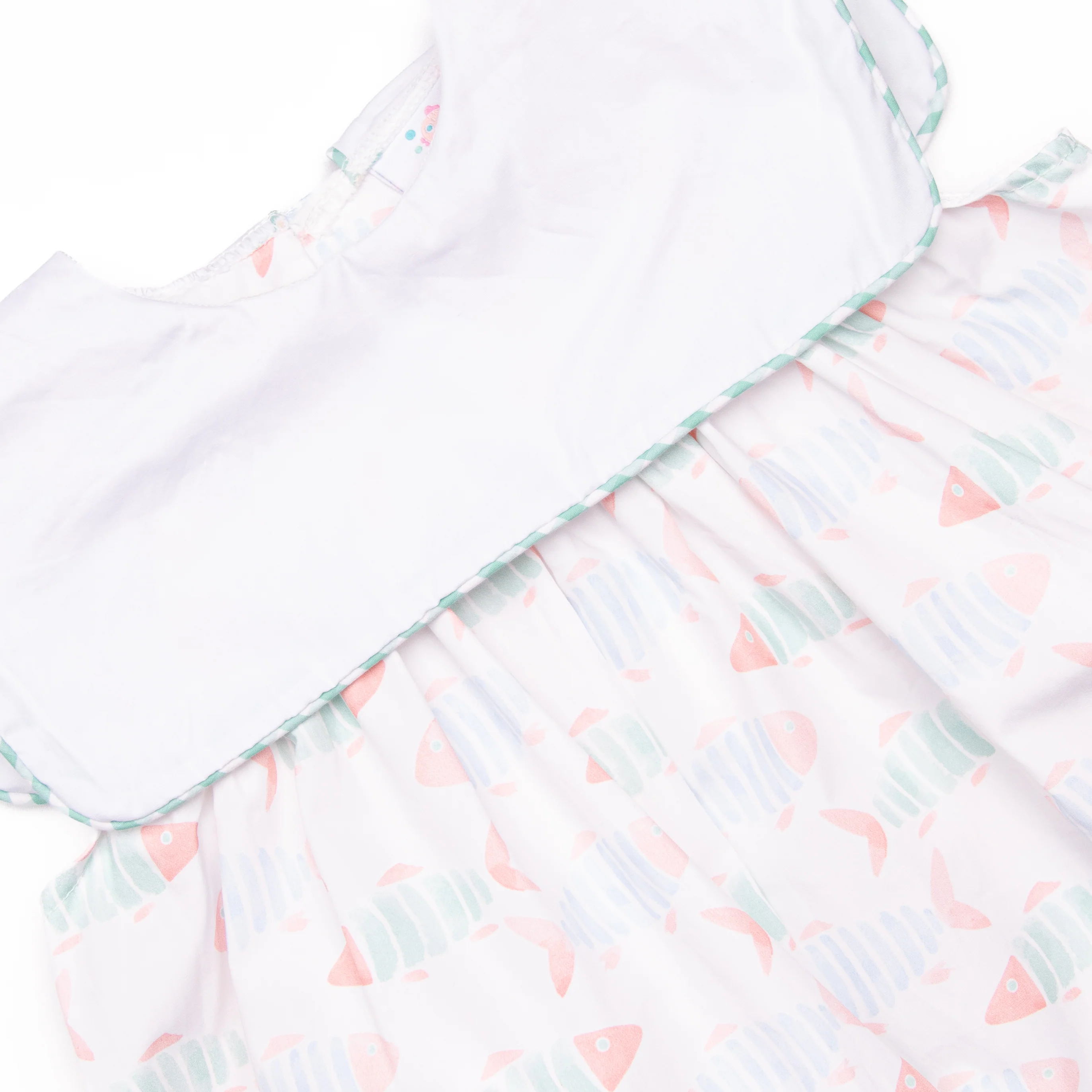 Her days will be full of wonders in watercolor! This dress features a pastel fish print, mint green gingham trim and a bib collar detail. She will look wonderful in this dress!