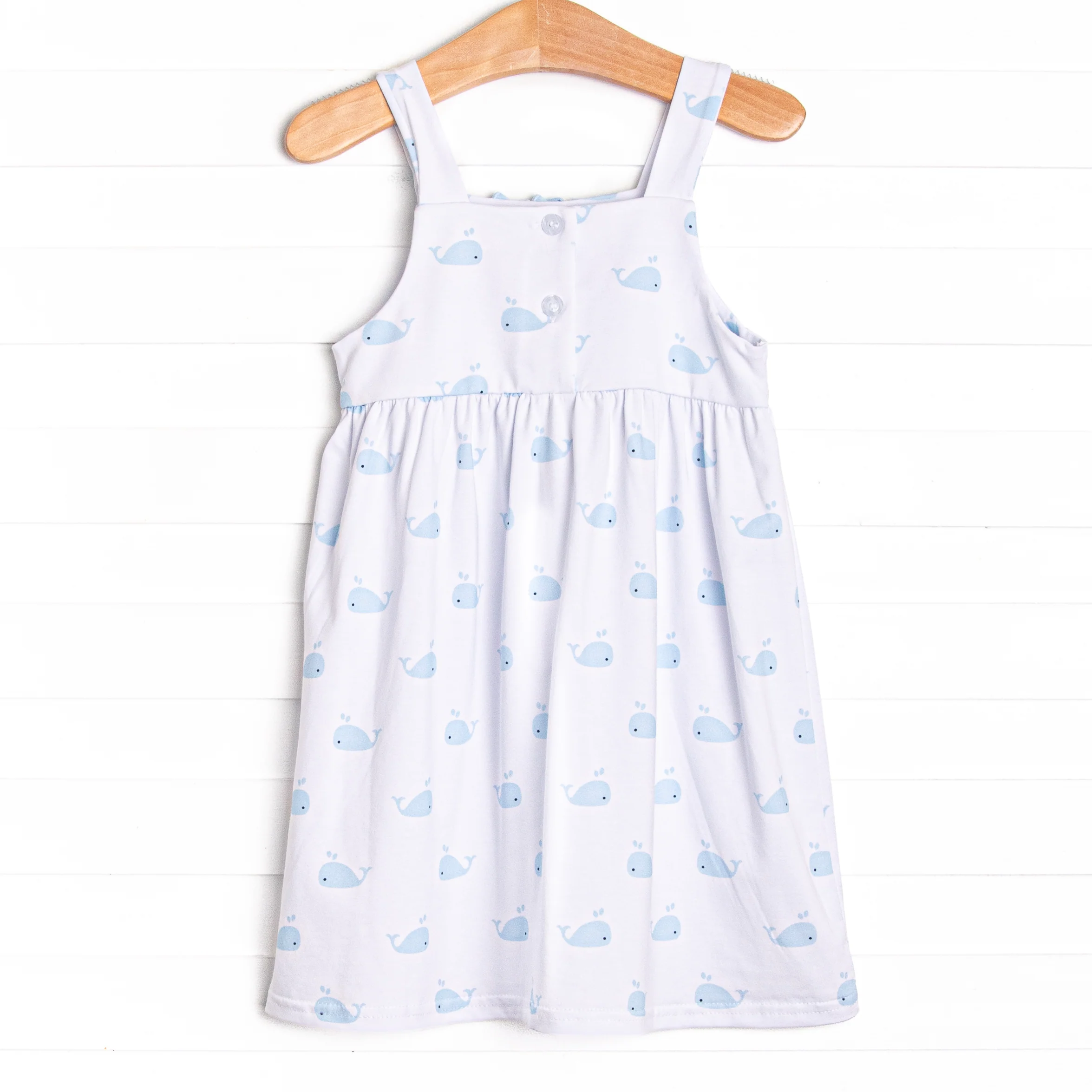 Get ready to Whale Watch! This dress features a whale print, the softest knit material, and blue ruffles details. This dress is SHORE-ly going to be her new favorite!