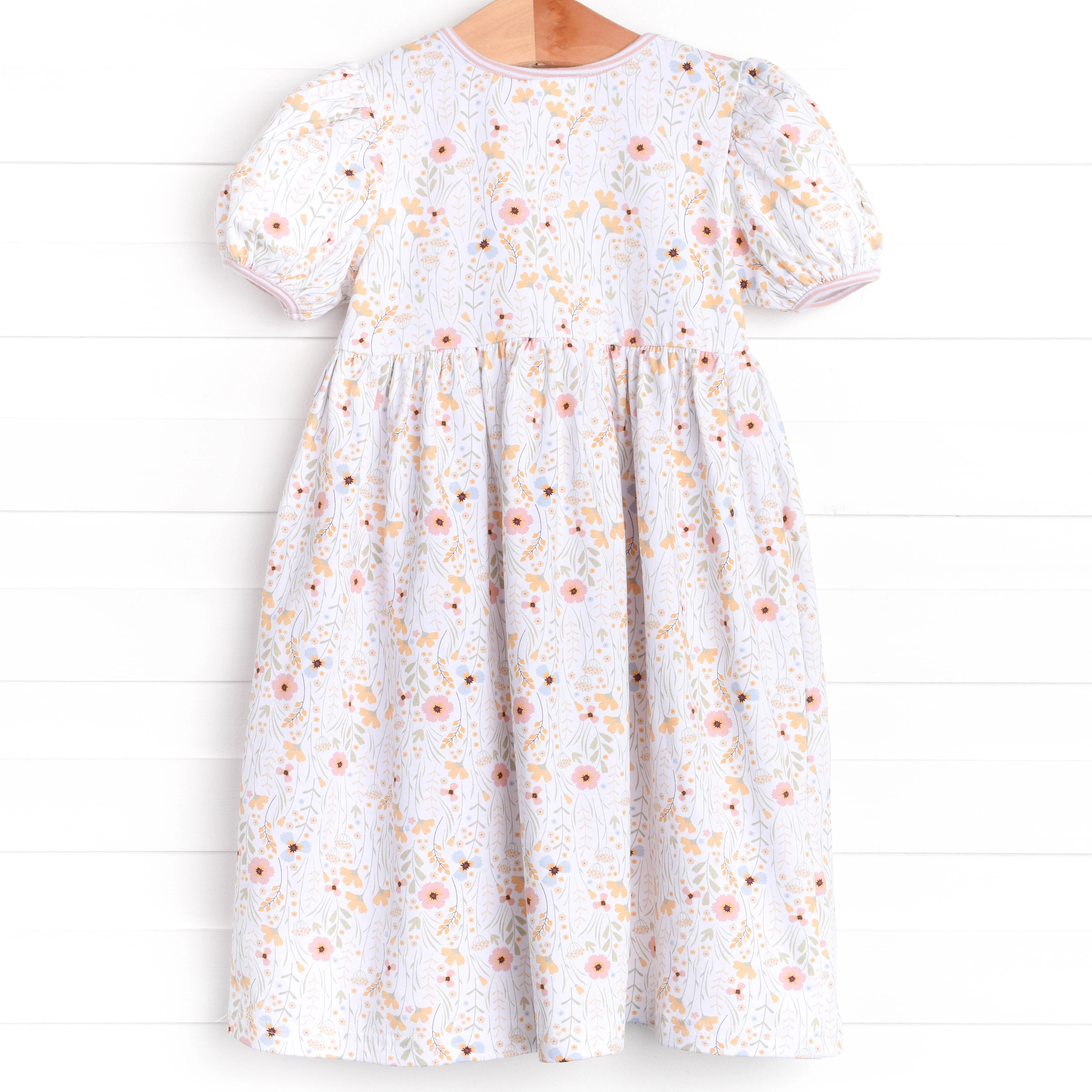 This dress is all you can wish for! The Wildflower Wishes dress features light pink trim around neck, the cutest buttons down the front, and ruffle pocket detail! Your little one will love this dress!
